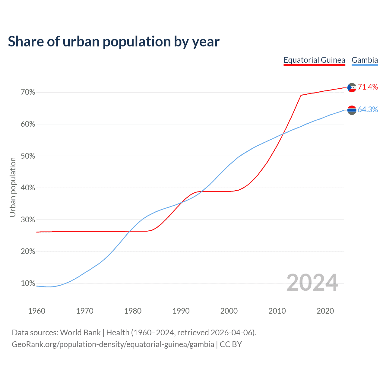 From 2004 to 2024, the share of urban population changed from 40.9% to 71.4% in Equatorial Guinea and from 51.5% to 64.3% in the Gambia.