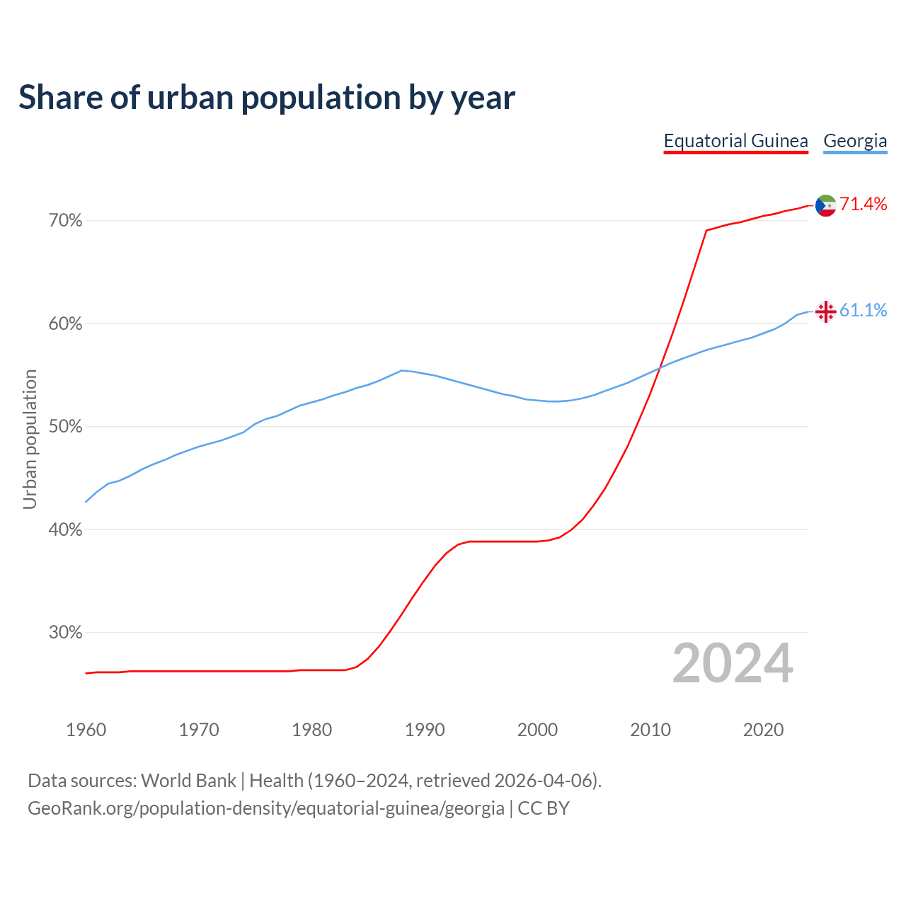 From 2004 to 2024, the share of urban population changed from 40.9% to 71.4% in Equatorial Guinea and from 52.7% to 61.1% in Georgia.