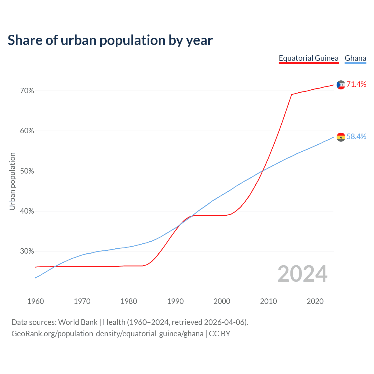 From 2006 to 2026, population density in Equatorial Guinea increased by 100.5%, compared to a 55% growth in Ghana.
