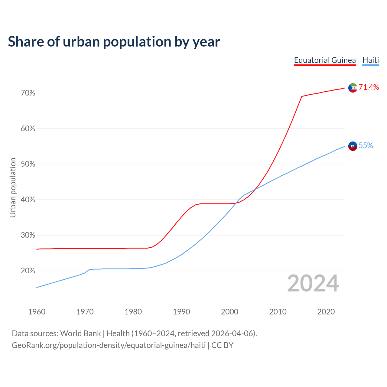 From 2004 to 2024, the share of urban population changed from 40.9% to 71.4% in Equatorial Guinea and from 41.9% to 55% in Haiti.