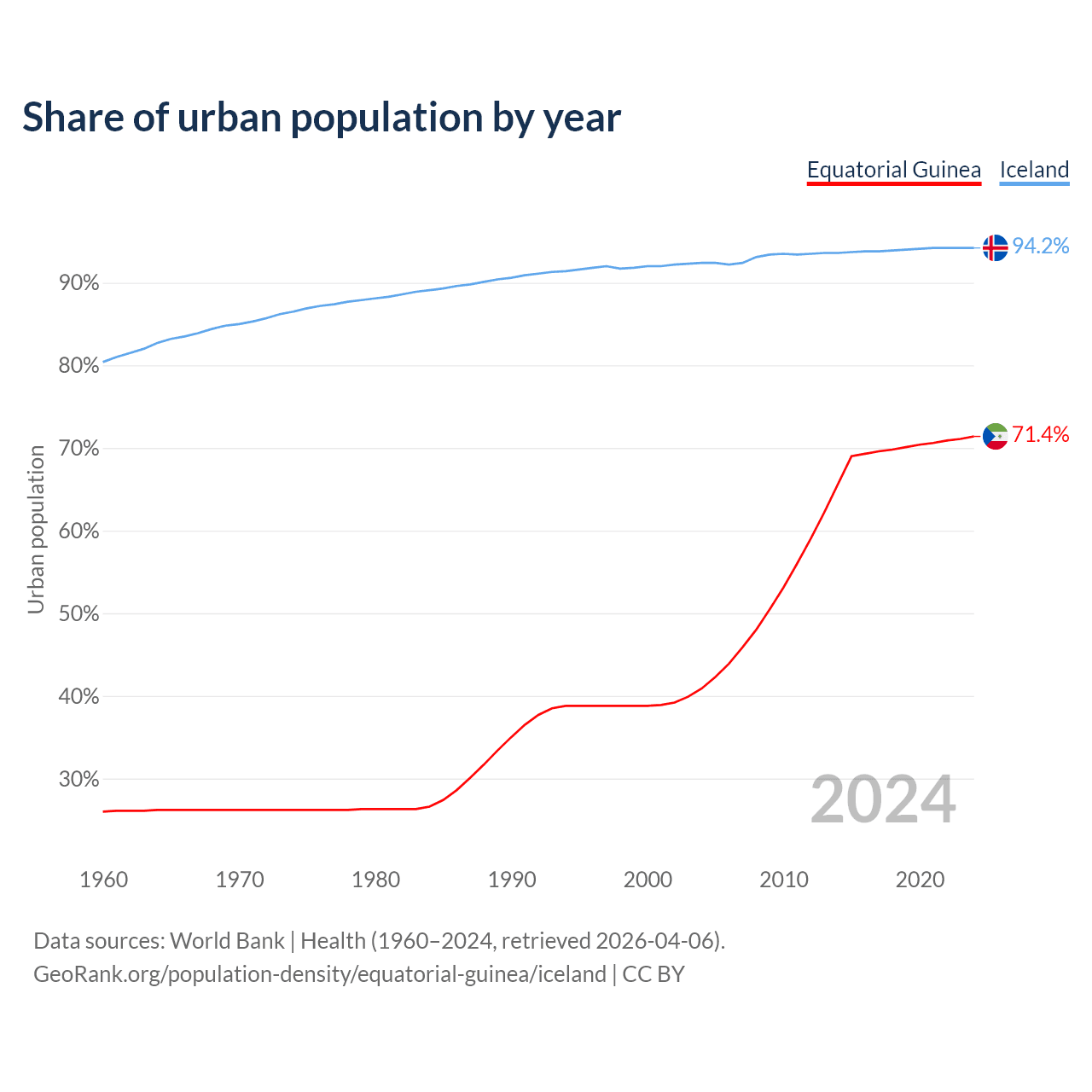 From 2004 to 2024, the share of urban population changed from 40.9% to 71.4% in Equatorial Guinea and from 92.4% to 94.2% in Iceland.
