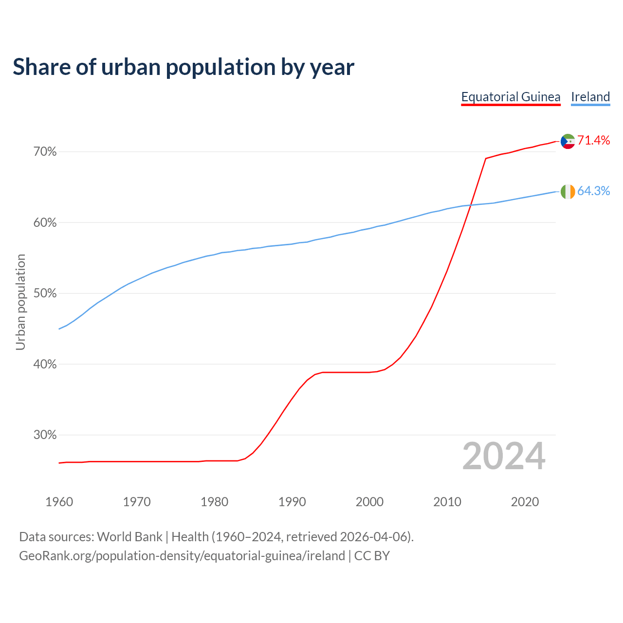 From 2004 to 2024, the share of urban population changed from 40.9% to 71.4% in Equatorial Guinea and from 60.2% to 64.3% in Ireland.