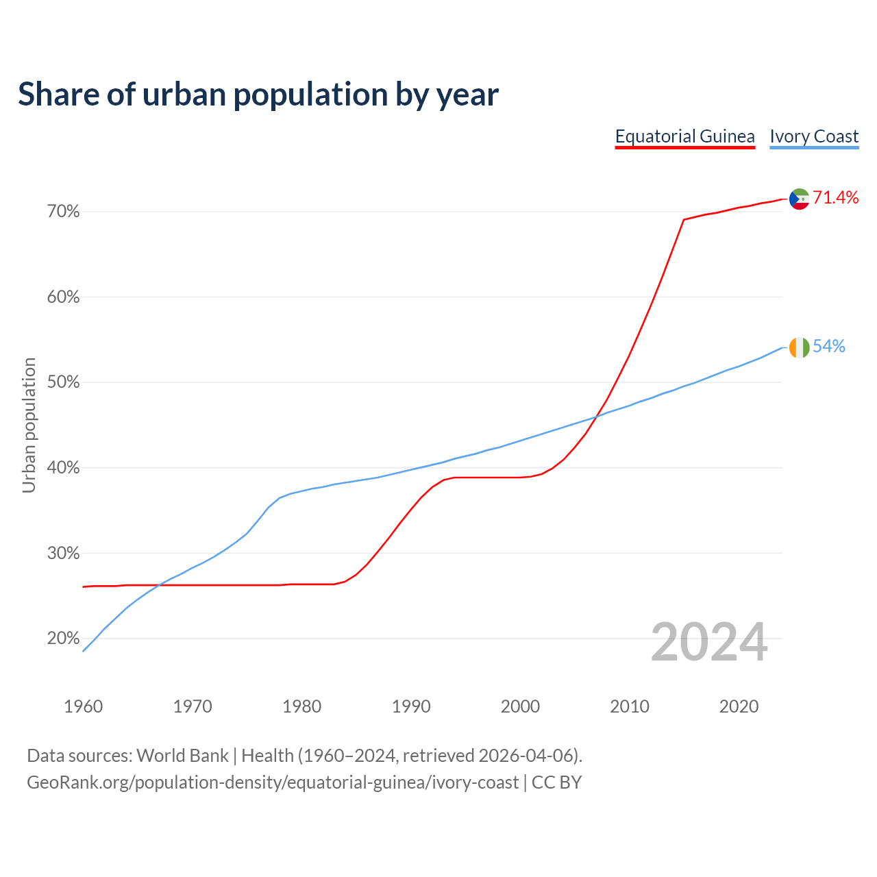 From 2004 to 2024, the share of urban population changed from 40.9% to 71.4% in Equatorial Guinea and from 44.7% to 54% in Ivory Coast.