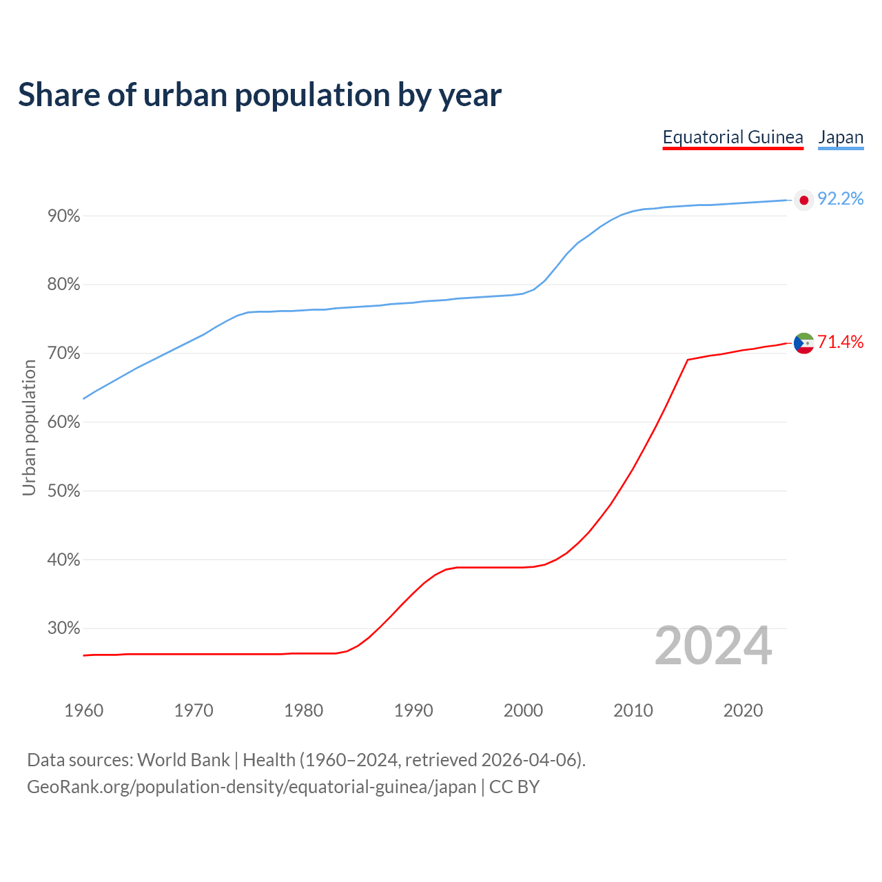 From 2004 to 2024, the share of urban population changed from 40.9% to 71.4% in Equatorial Guinea and from 84.4% to 92.2% in Japan.