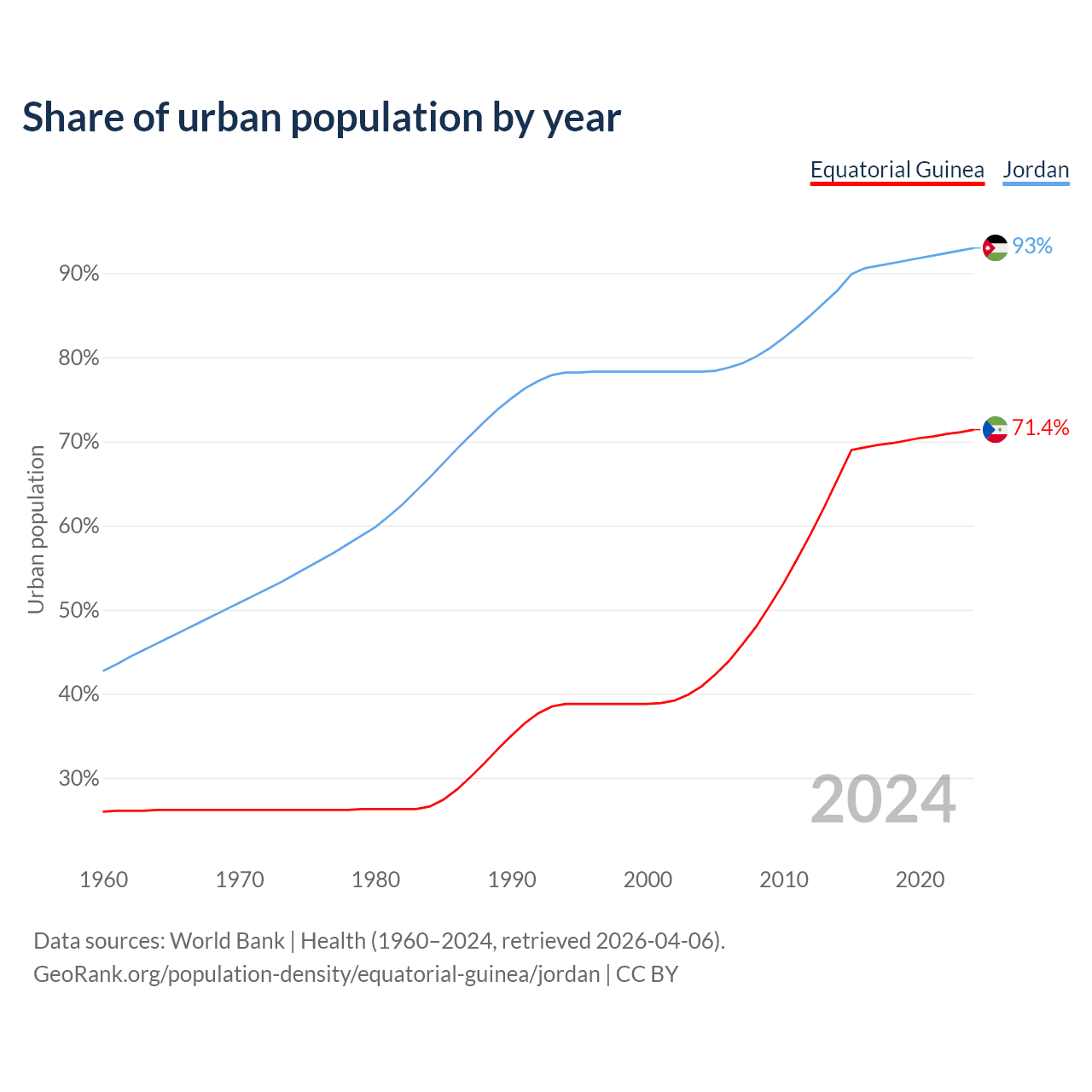 From 2004 to 2024, the share of urban population changed from 40.9% to 71.4% in Equatorial Guinea and from 78.3% to 93% in Jordan.