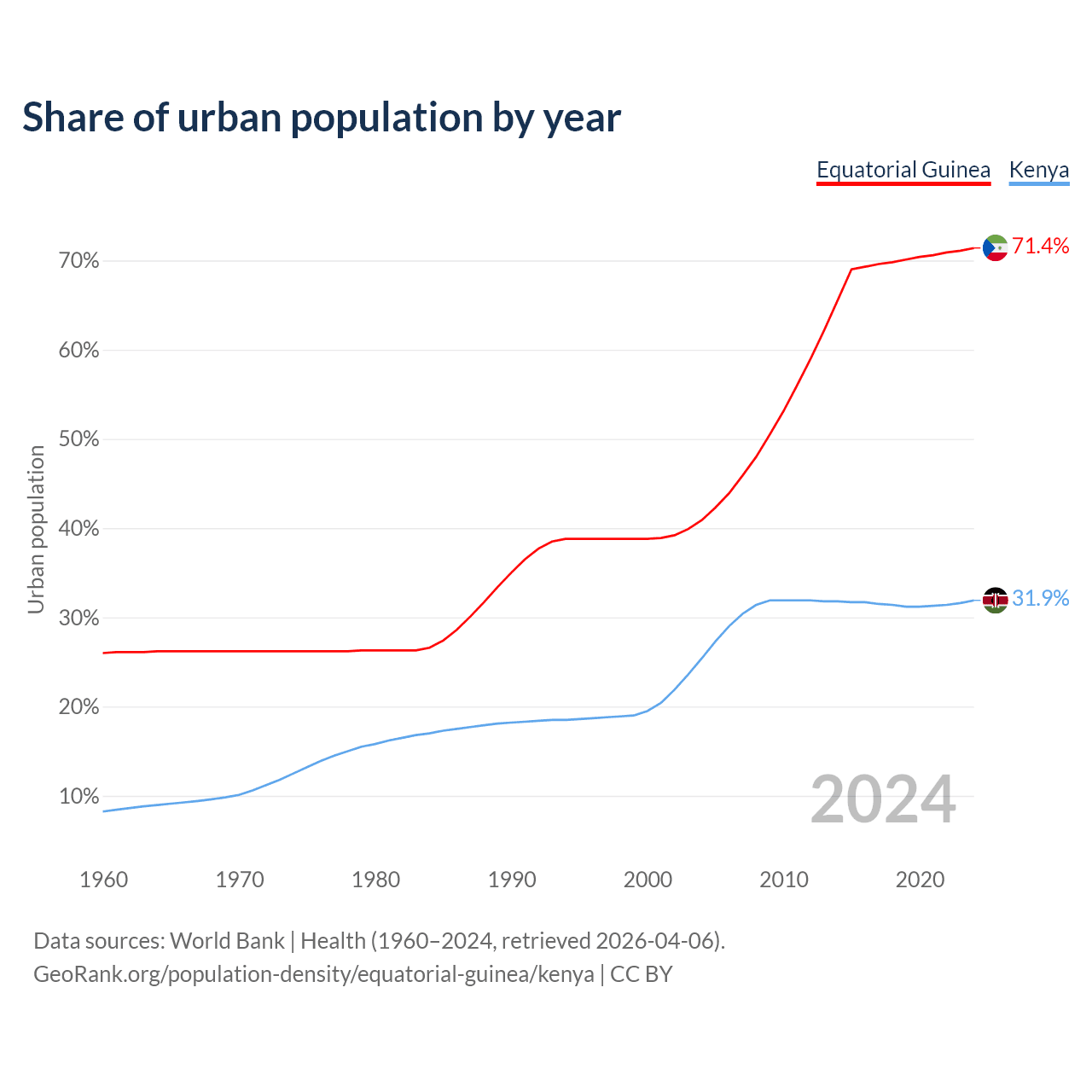 From 2004 to 2024, the share of urban population changed from 40.9% to 71.4% in Equatorial Guinea and from 25.4% to 31.9% in Kenya.
