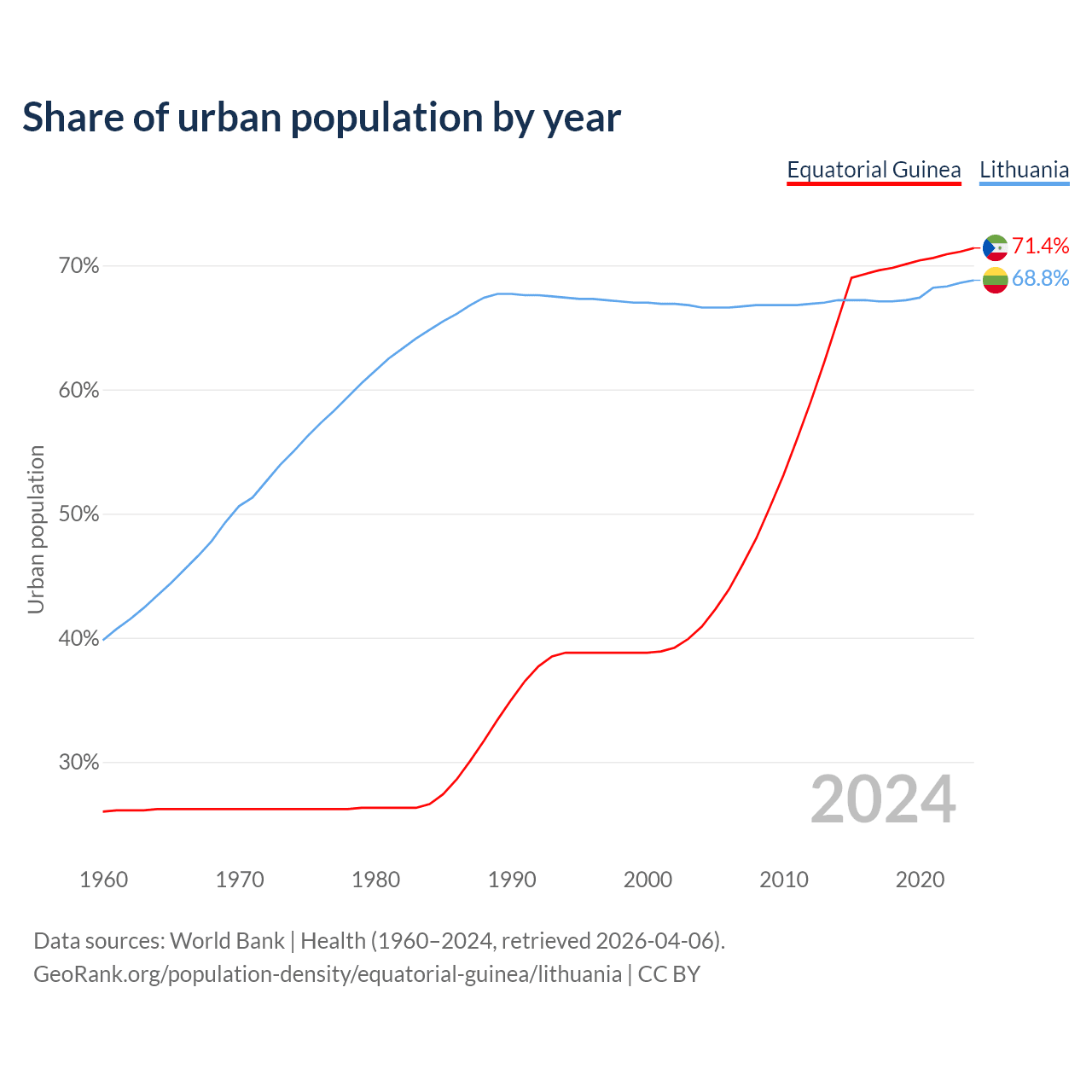From 2004 to 2024, the share of urban population changed from 40.9% to 71.4% in Equatorial Guinea and from 66.6% to 68.8% in Lithuania.