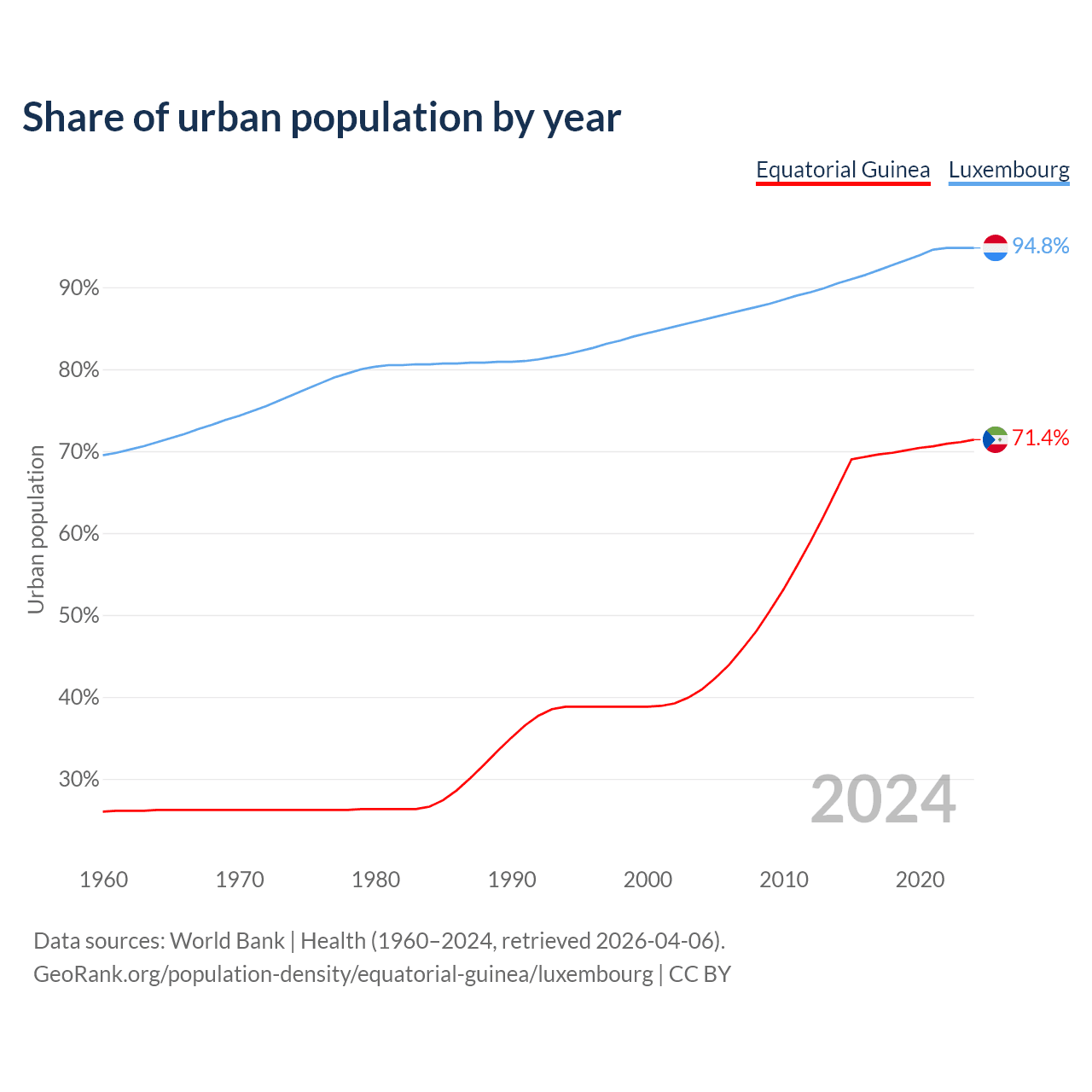 From 2004 to 2024, the share of urban population changed from 40.9% to 71.4% in Equatorial Guinea and from 86% to 94.8% in Luxembourg.