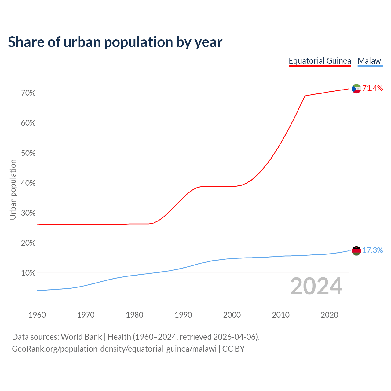 From 2004 to 2024, the share of urban population changed from 40.9% to 71.4% in Equatorial Guinea and from 15% to 17.3% in Malawi.