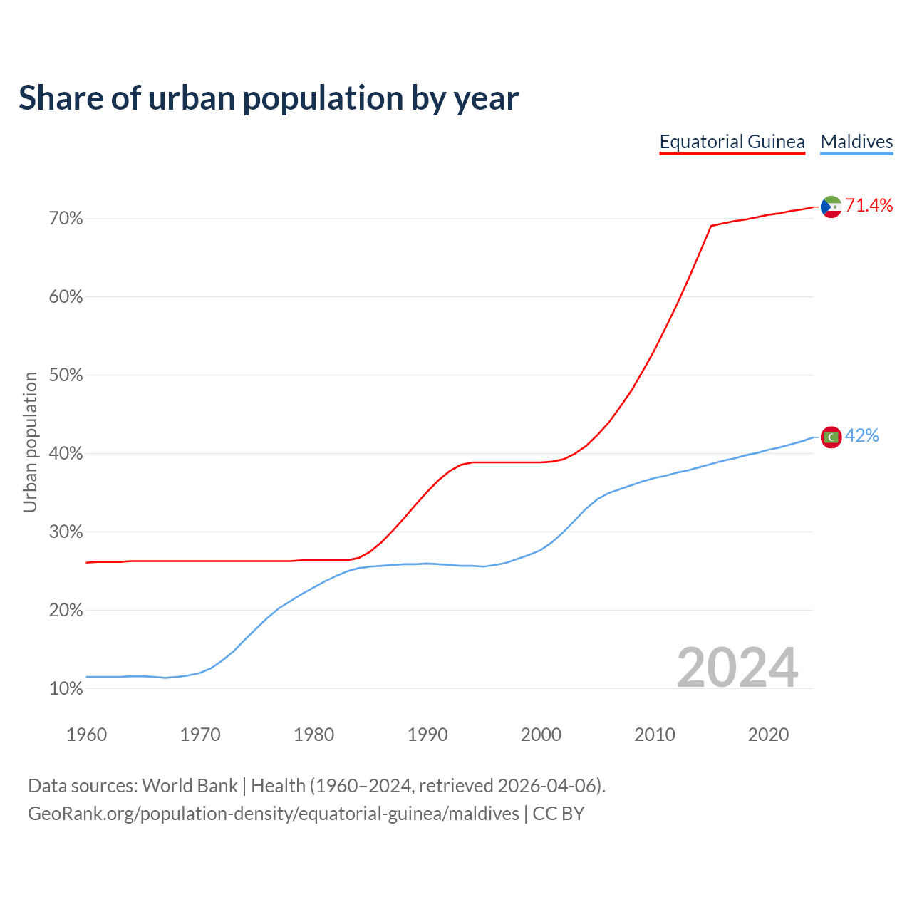 From 2004 to 2024, the share of urban population changed from 40.9% to 71.4% in Equatorial Guinea and from 32.9% to 42% in Maldives.