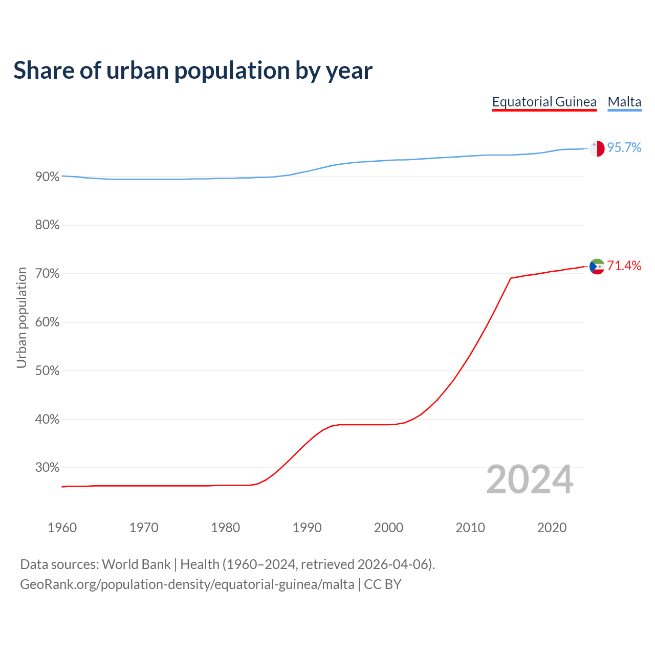 From 2004 to 2024, the share of urban population changed from 40.9% to 71.4% in Equatorial Guinea and from 93.6% to 95.7% in Malta.