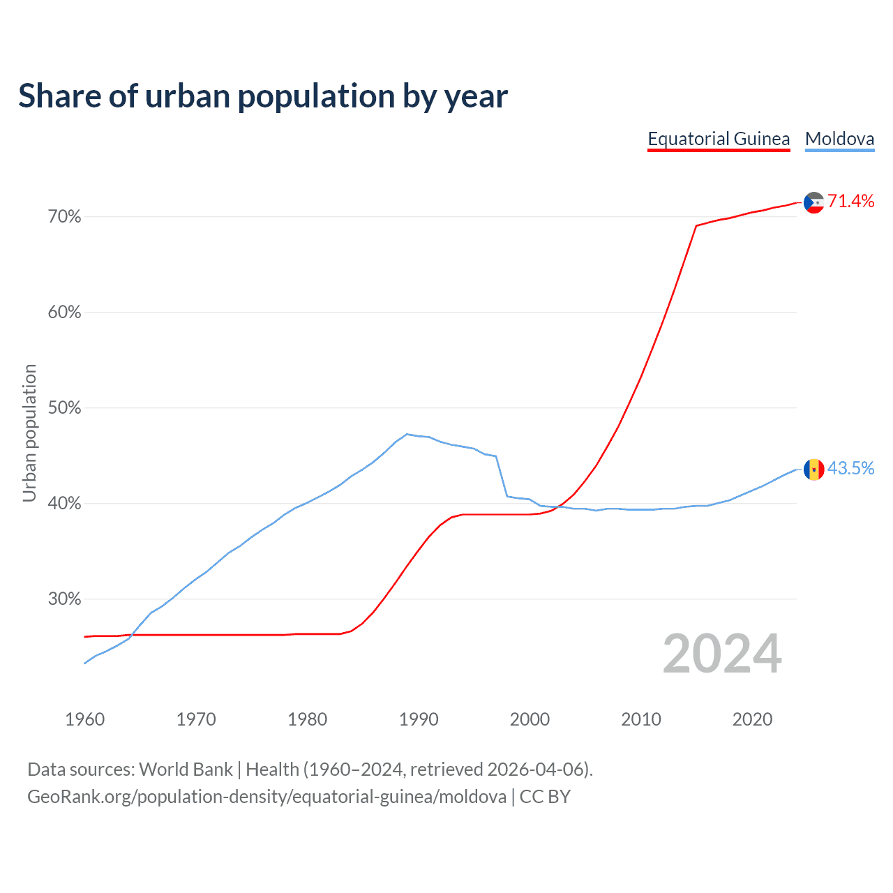From 2004 to 2024, the share of urban population changed from 40.9% to 71.4% in Equatorial Guinea and from 39.4% to 43.5% in Moldova.