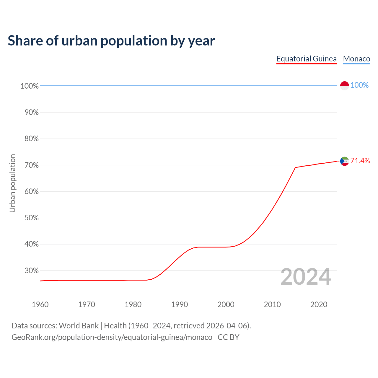 From 2004 to 2024, the share of urban population changed from 40.9% to 71.4% in Equatorial Guinea and from 100% to 100% in Monaco.