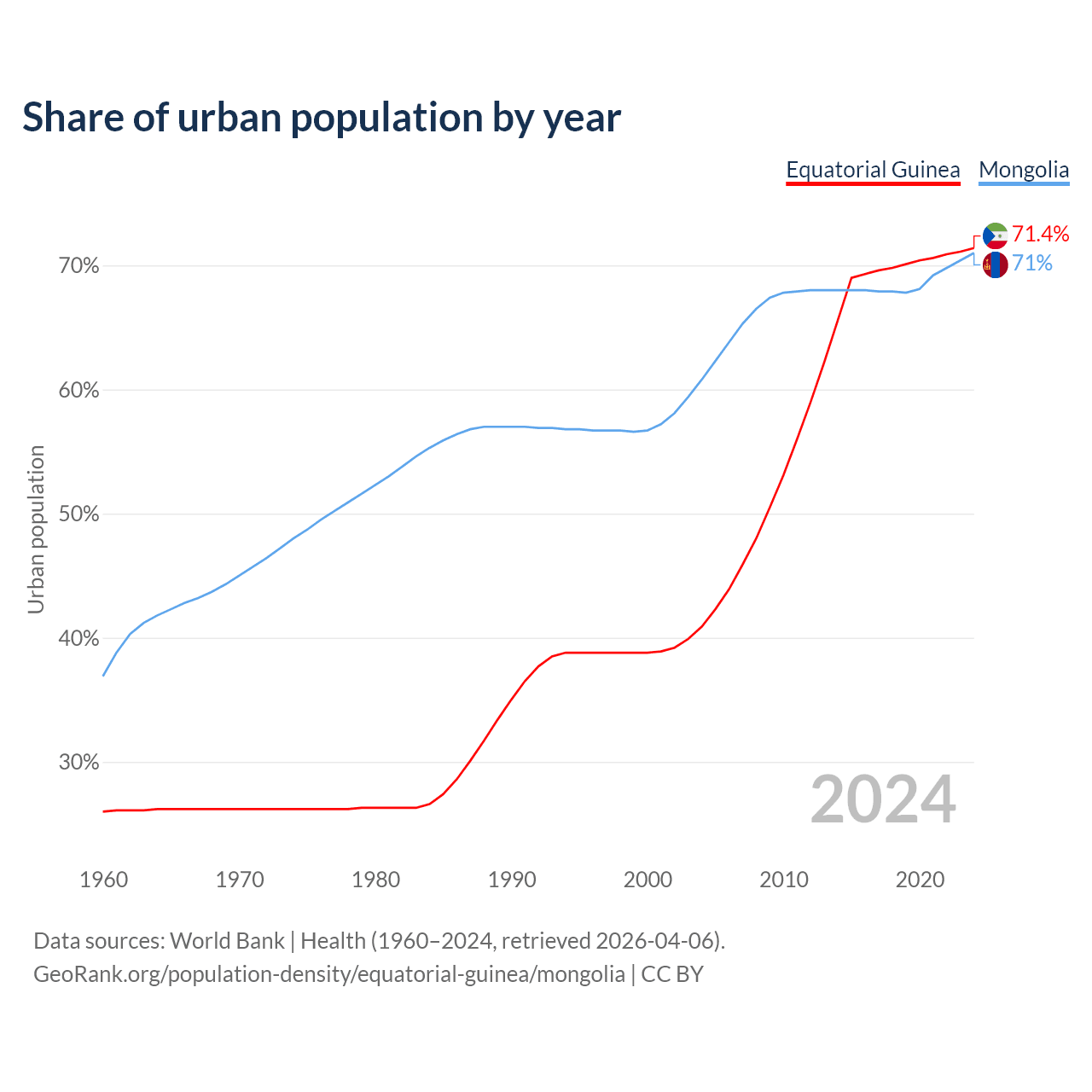From 2004 to 2024, the share of urban population changed from 40.9% to 71.4% in Equatorial Guinea and from 60.8% to 71% in Mongolia.