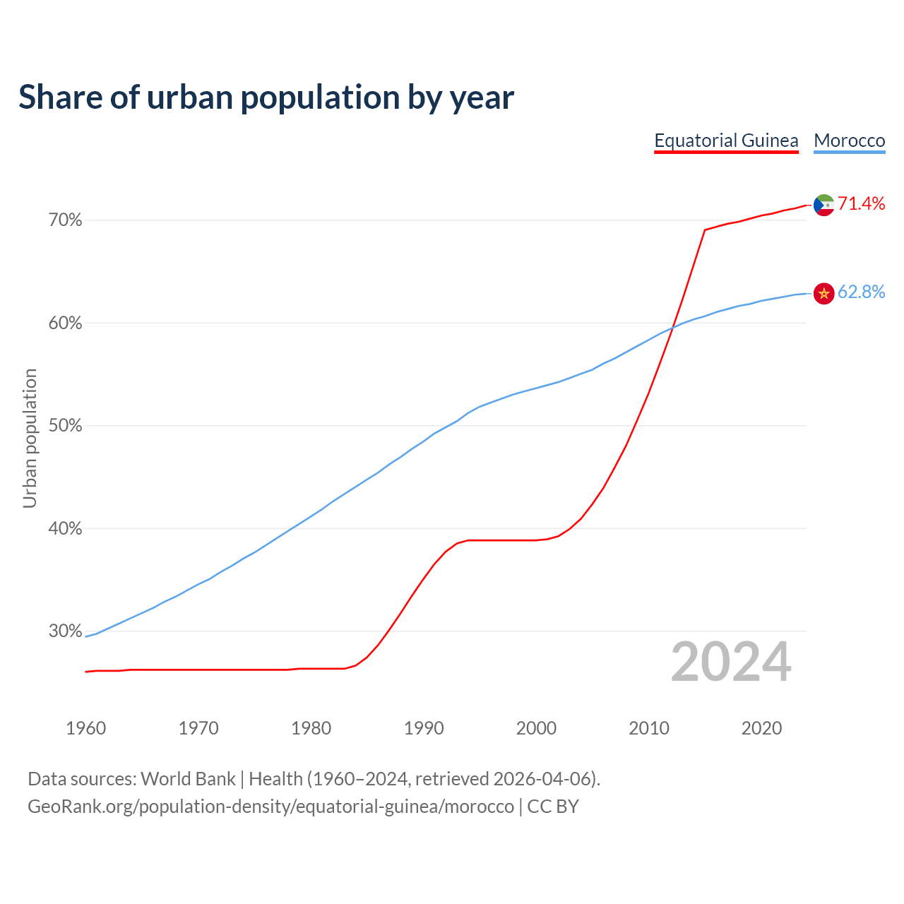 From 2004 to 2024, the share of urban population changed from 40.9% to 71.4% in Equatorial Guinea and from 55% to 62.8% in Morocco.