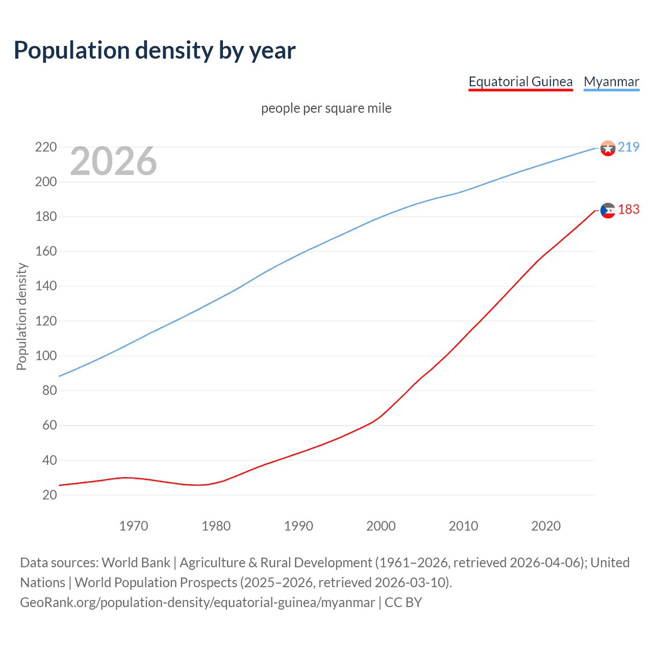 From 2006 to 2026, population density in Equatorial Guinea increased by 100.5%, compared to a 15.7% growth in Myanmar.