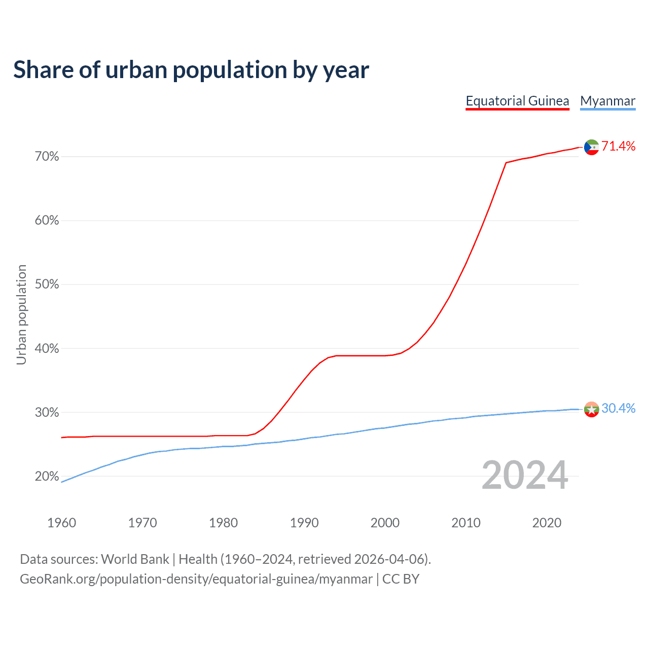 From 2004 to 2024, the share of urban population changed from 40.9% to 71.4% in Equatorial Guinea and from 28.2% to 30.4% in Myanmar.