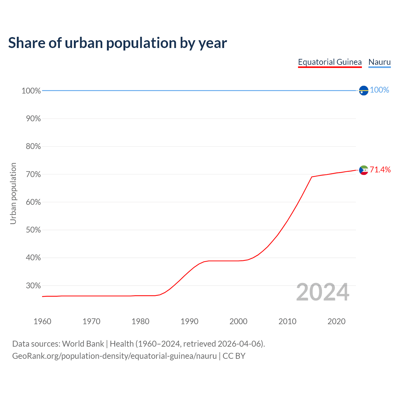 From 2004 to 2024, the share of urban population changed from 40.9% to 71.4% in Equatorial Guinea and from 100% to 100% in Nauru.