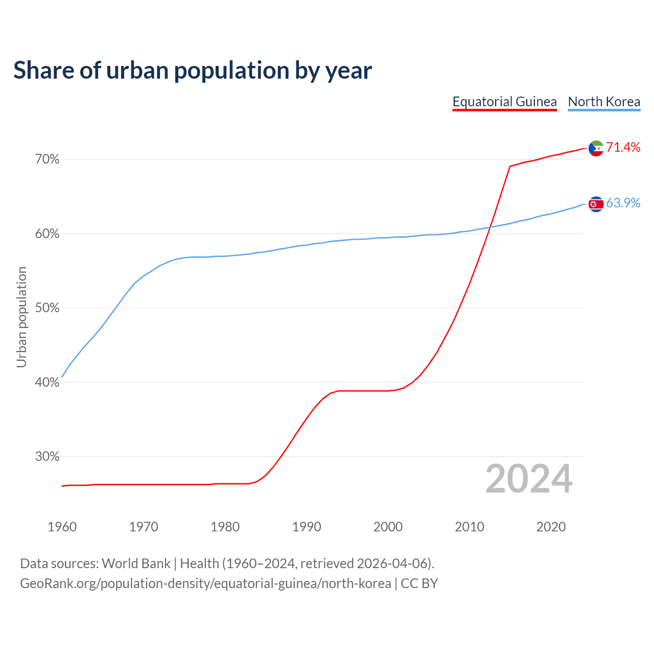 From 2004 to 2024, the share of urban population changed from 40.9% to 71.4% in Equatorial Guinea and from 59.7% to 63.9% in North Korea.
