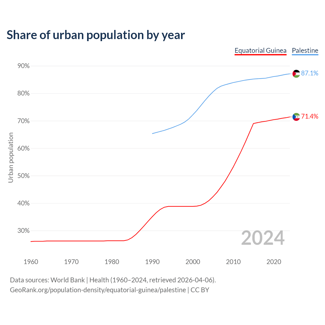 From 2004 to 2024, the share of urban population changed from 40.9% to 71.4% in Equatorial Guinea and from 79% to 87.1% in Palestine.