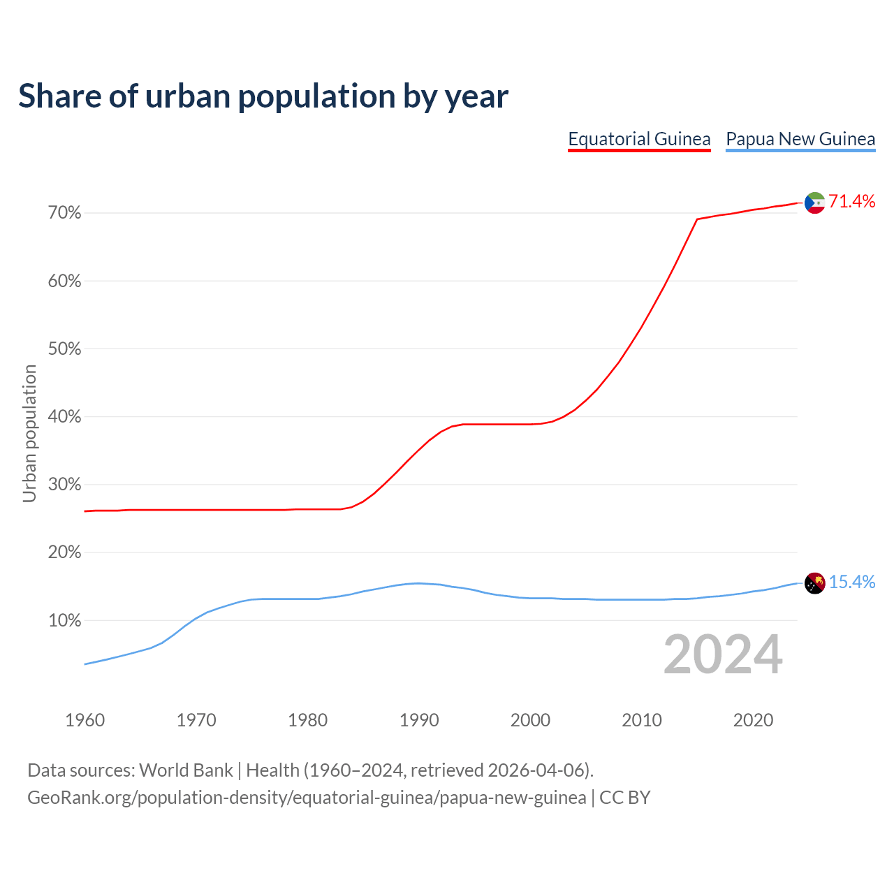 From 2004 to 2024, the share of urban population changed from 40.9% to 71.4% in Equatorial Guinea and from 13.1% to 15.4% in Papua New Guinea.