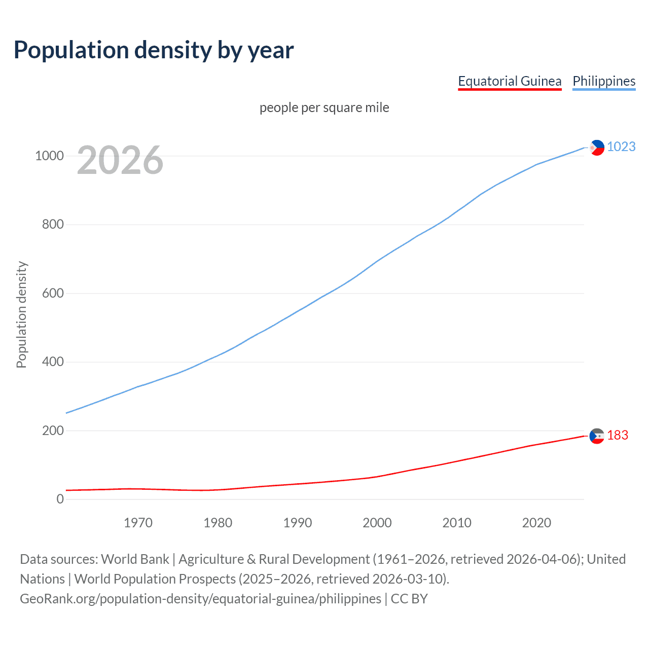 From 2006 to 2026, population density in Equatorial Guinea increased by 100.5%, compared to a 31.5% growth in the Philippines.