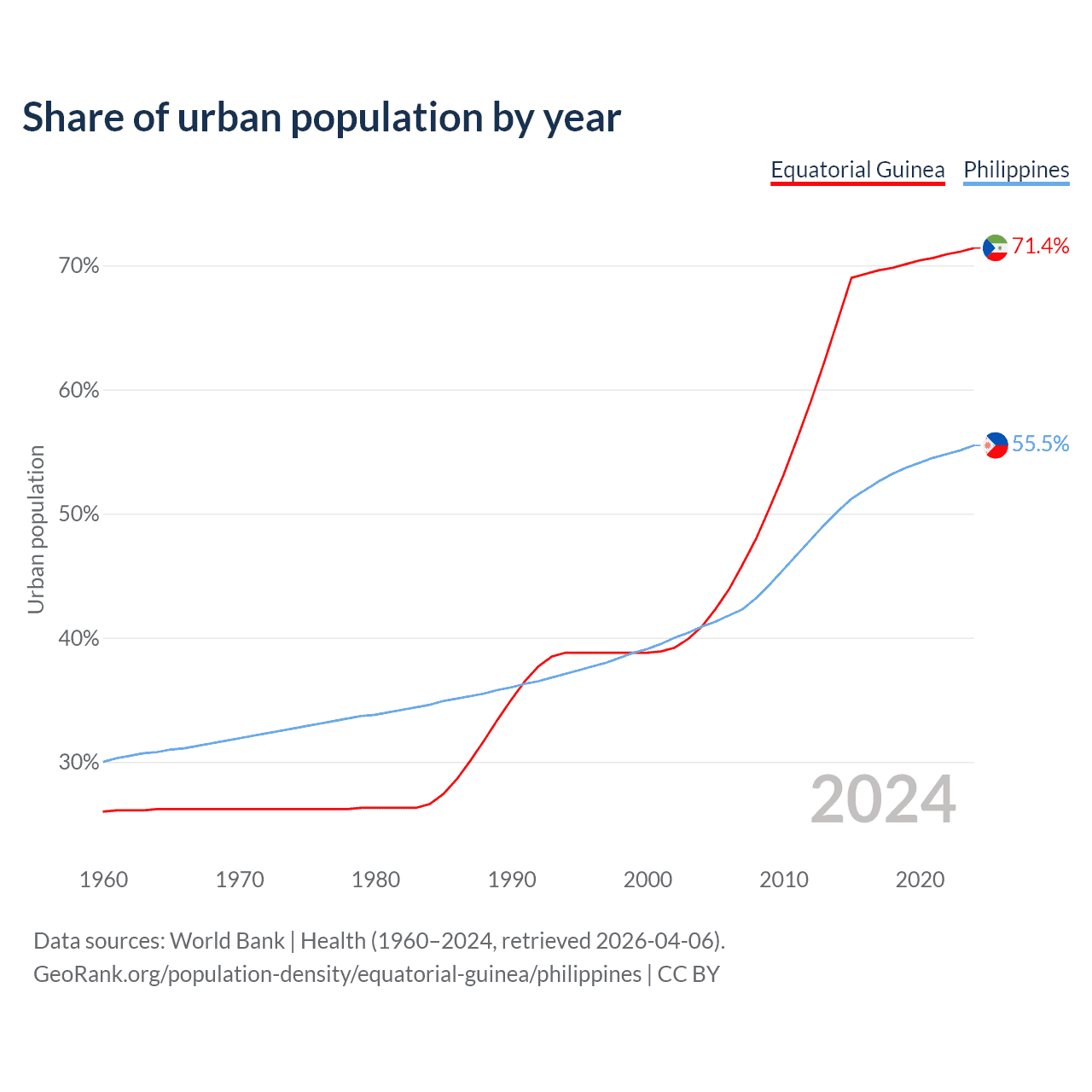 From 2004 to 2024, the share of urban population changed from 40.9% to 71.4% in Equatorial Guinea and from 40.9% to 55.5% in the Philippines.