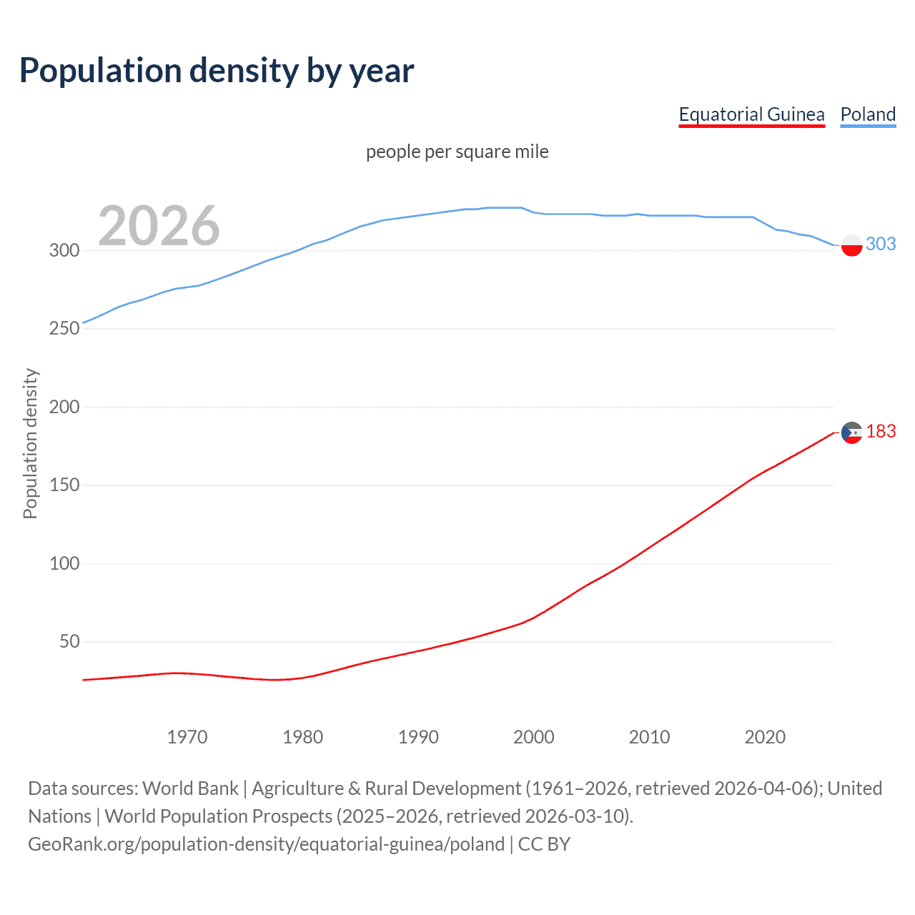 From 2006 to 2026, population density in Equatorial Guinea increased by 100.5%, compared to a 6.1% decline in Poland.