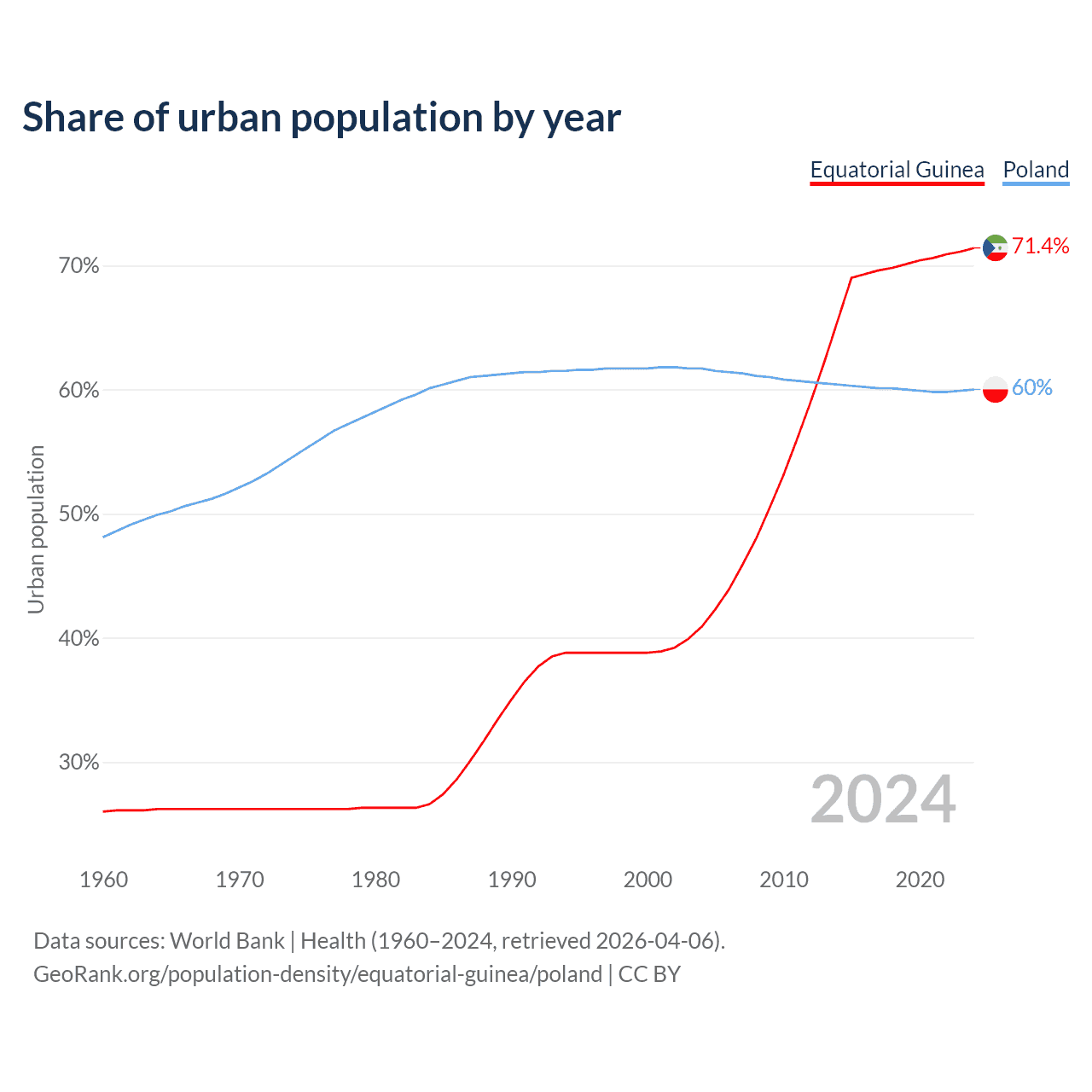 From 2004 to 2024, the share of urban population changed from 40.9% to 71.4% in Equatorial Guinea and from 61.7% to 60% in Poland.