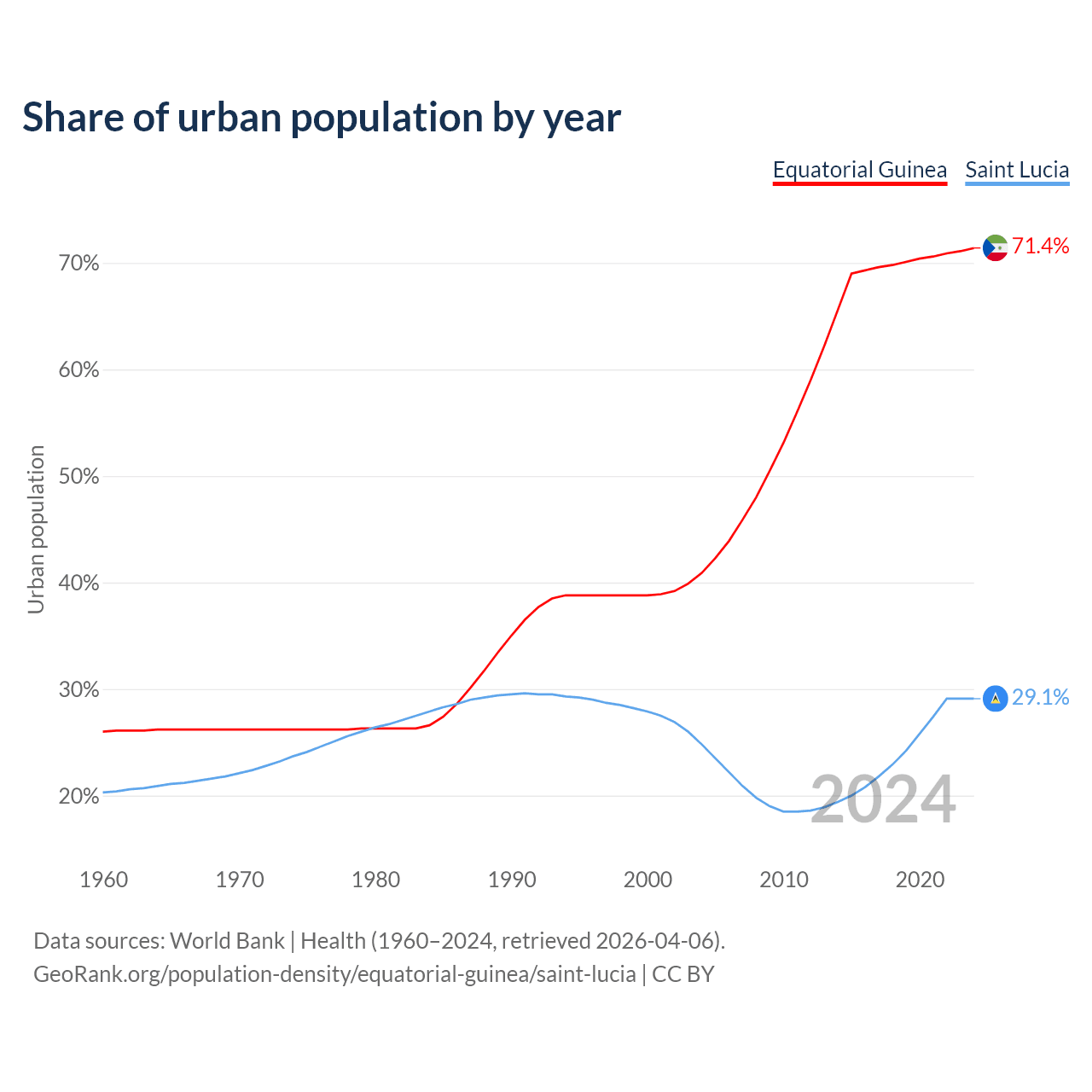 From 2004 to 2024, the share of urban population changed from 40.9% to 71.4% in Equatorial Guinea and from 24.8% to 29.1% in Saint Lucia.