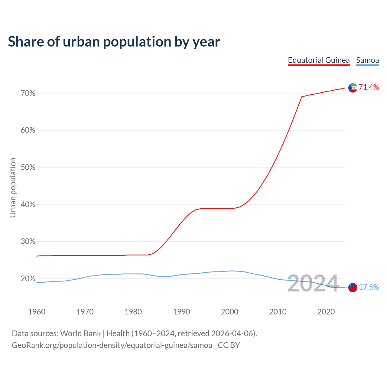 From 2004 to 2024, the share of urban population changed from 40.9% to 71.4% in Equatorial Guinea and from 21.5% to 17.5% in Samoa.