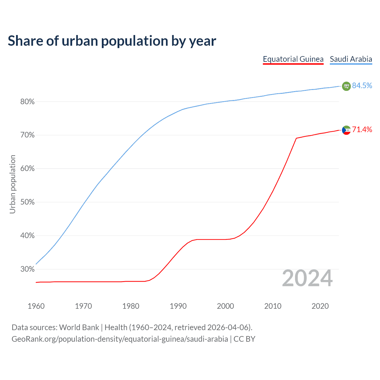 From 2004 to 2024, the share of urban population changed from 40.9% to 71.4% in Equatorial Guinea and from 80.8% to 84.5% in Saudi Arabia.