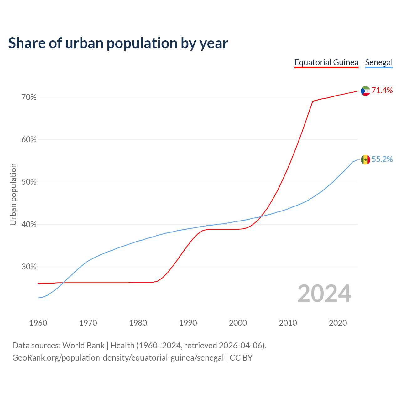 From 2004 to 2024, the share of urban population changed from 40.9% to 71.4% in Equatorial Guinea and from 41.6% to 55.2% in Senegal.