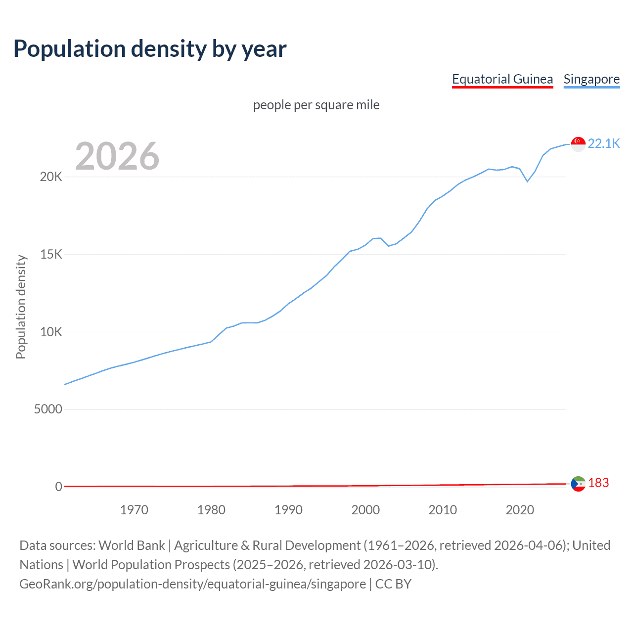 From 2006 to 2026, population density in Equatorial Guinea increased by 100.5%, compared to a 34.3% growth in Singapore.