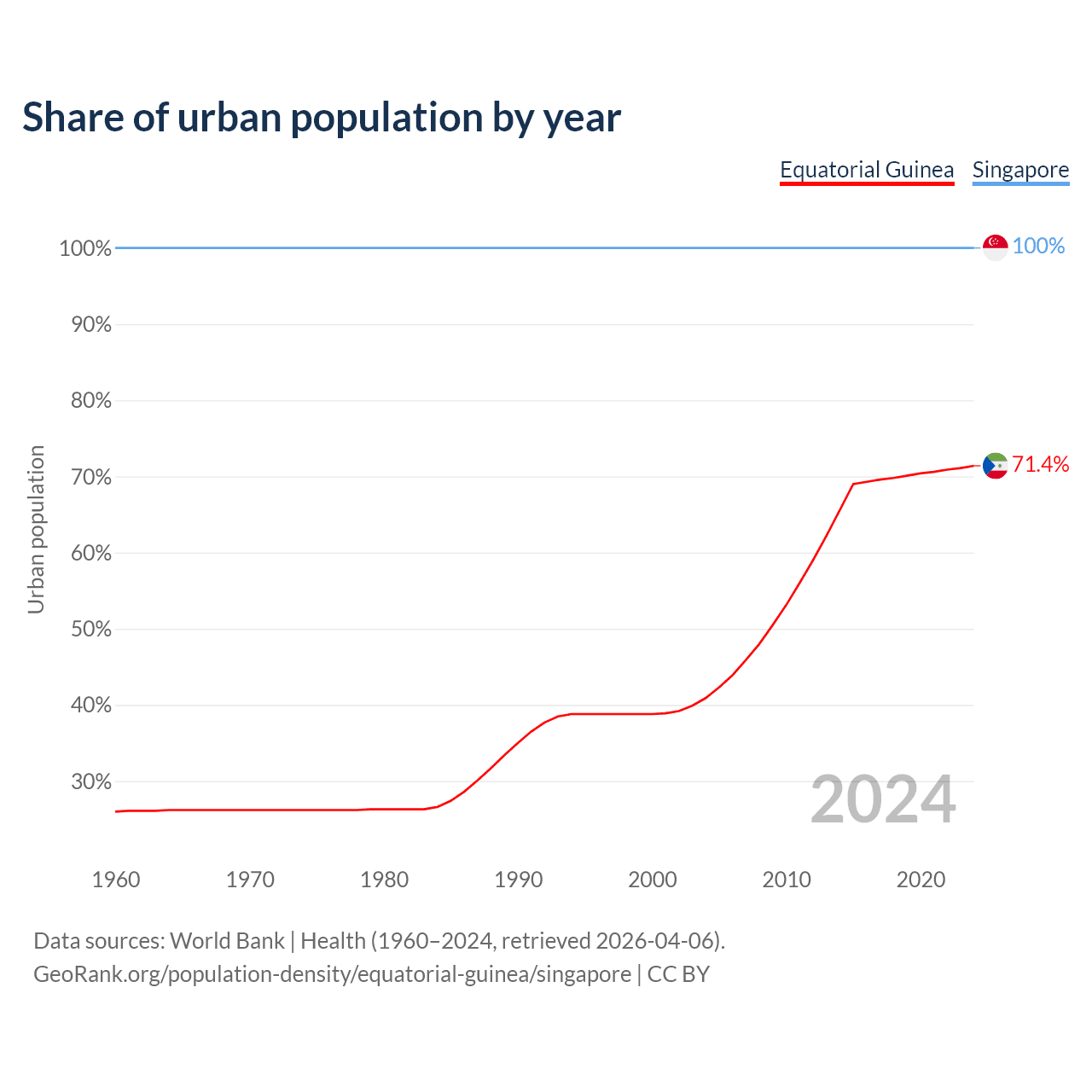 From 2004 to 2024, the share of urban population changed from 40.9% to 71.4% in Equatorial Guinea and from 100% to 100% in Singapore.