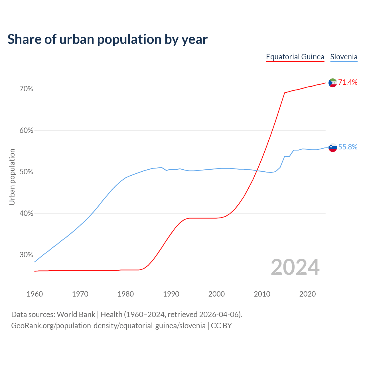 From 2004 to 2024, the share of urban population changed from 40.9% to 71.4% in Equatorial Guinea and from 50.7% to 55.8% in Slovenia.