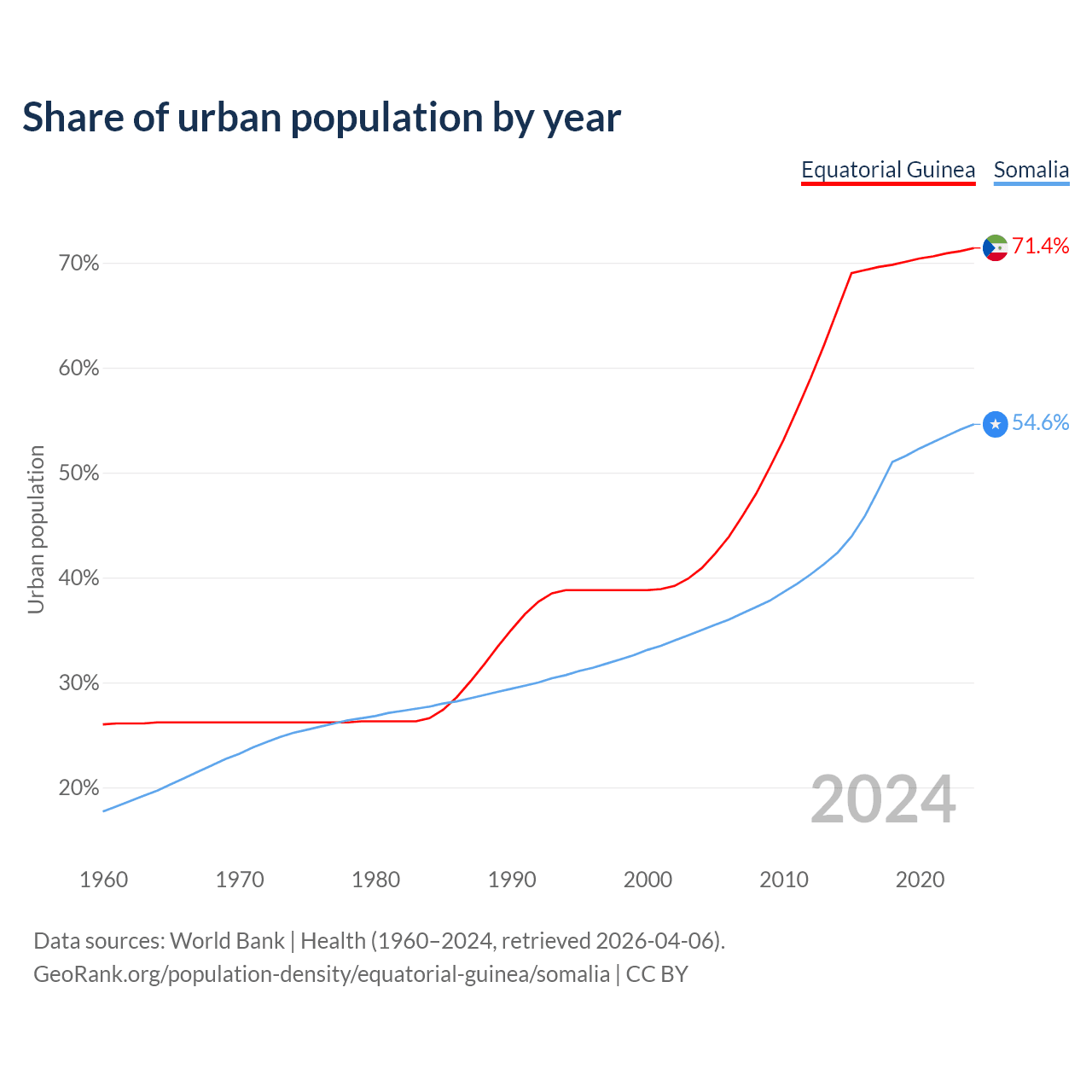 From 2004 to 2024, the share of urban population changed from 40.9% to 71.4% in Equatorial Guinea and from 35% to 54.6% in Somalia.
