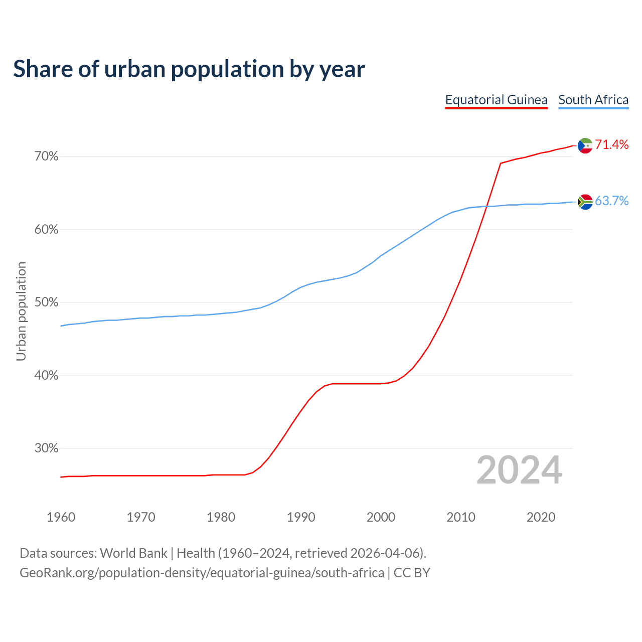 From 2004 to 2024, the share of urban population changed from 40.9% to 71.4% in Equatorial Guinea and from 59.1% to 63.7% in South Africa.