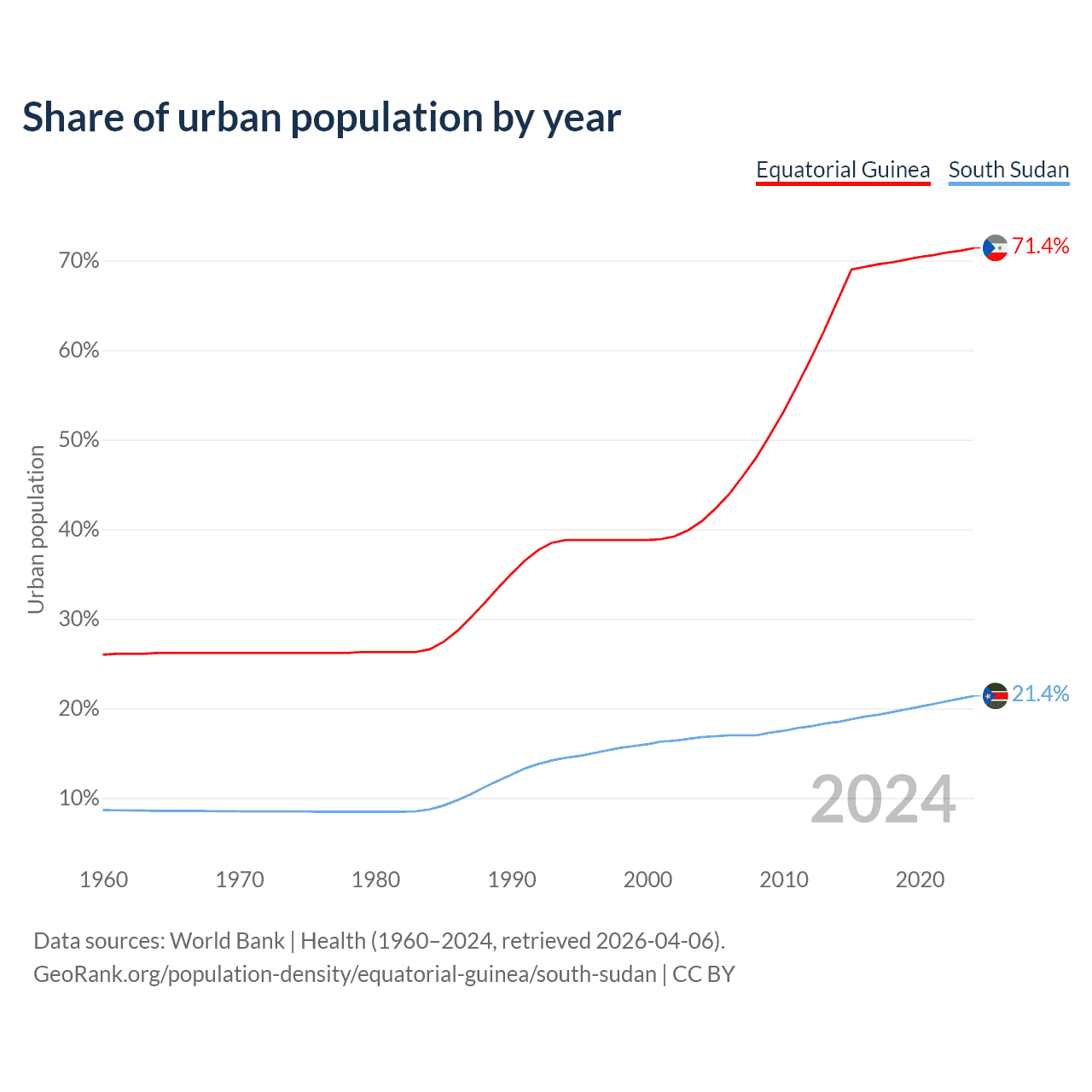 From 2004 to 2024, the share of urban population changed from 40.9% to 71.4% in Equatorial Guinea and from 16.8% to 21.4% in South Sudan.