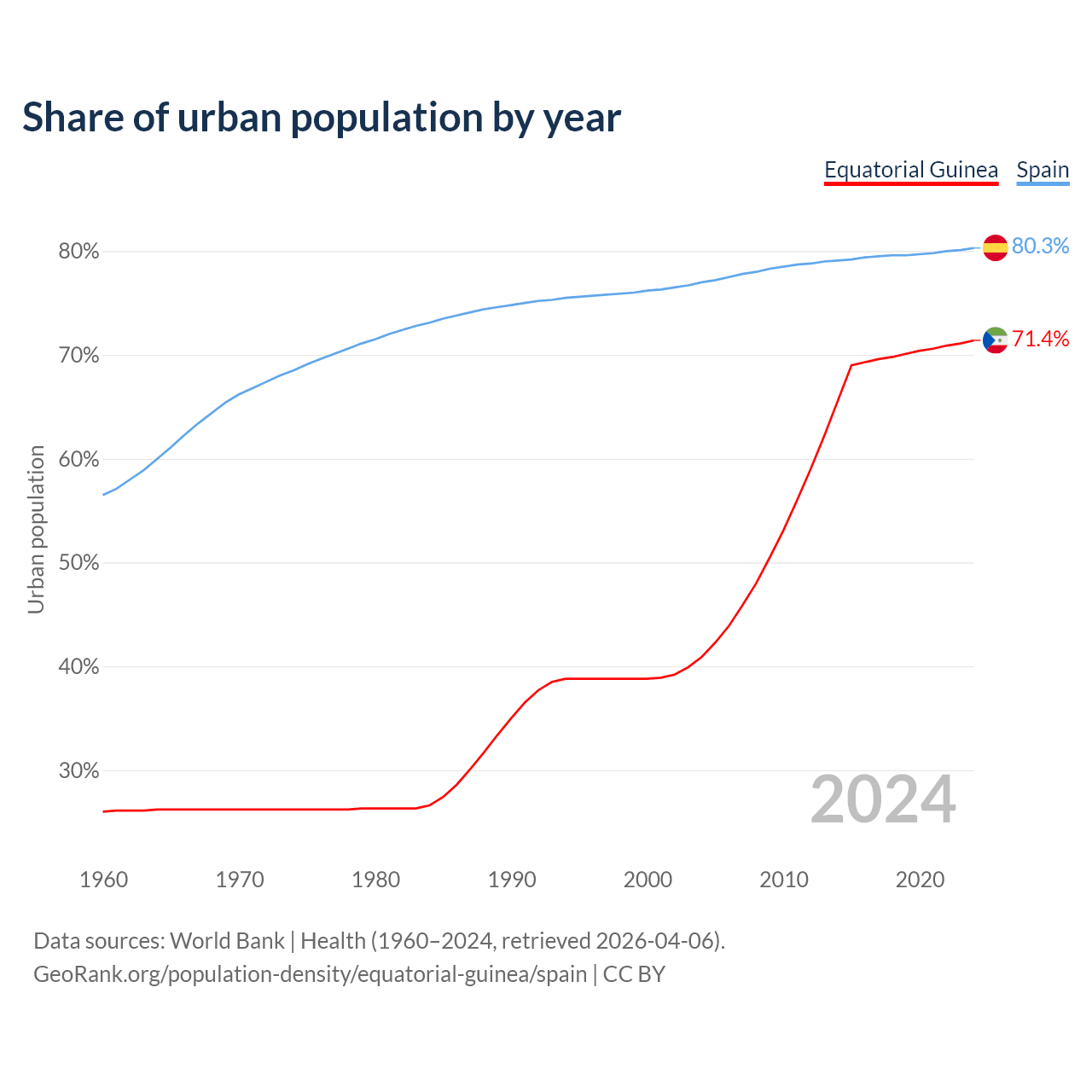 From 2004 to 2024, the share of urban population changed from 40.9% to 71.4% in Equatorial Guinea and from 77% to 80.3% in Spain.