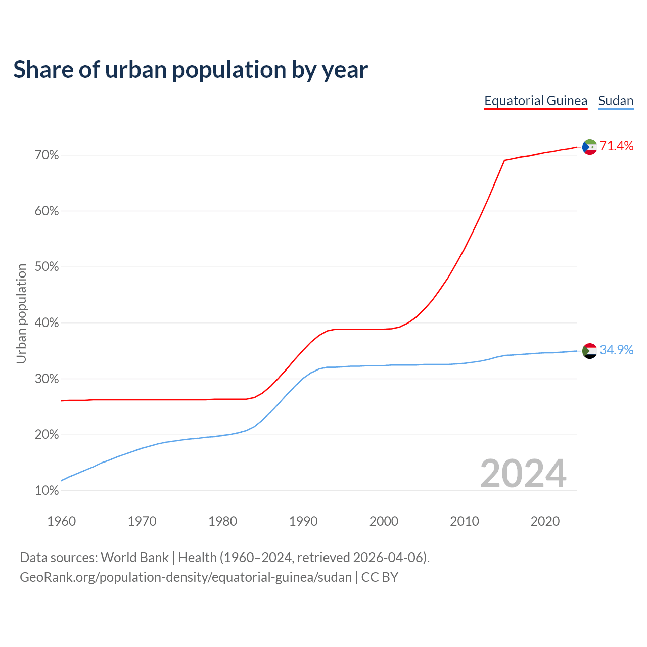 From 2004 to 2024, the share of urban population changed from 40.9% to 71.4% in Equatorial Guinea and from 32.4% to 34.9% in Sudan.