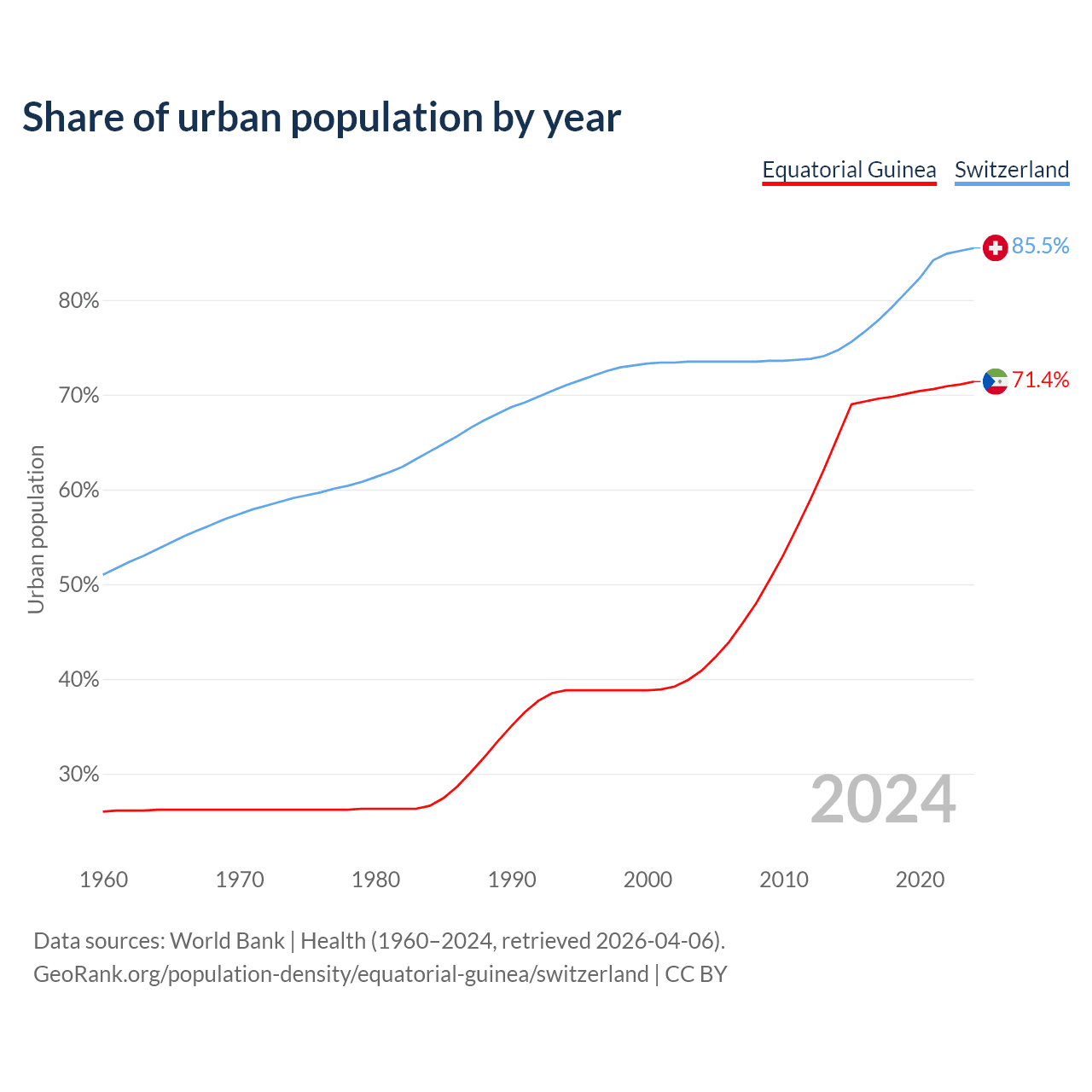From 2004 to 2024, the share of urban population changed from 40.9% to 71.4% in Equatorial Guinea and from 73.5% to 85.5% in Switzerland.