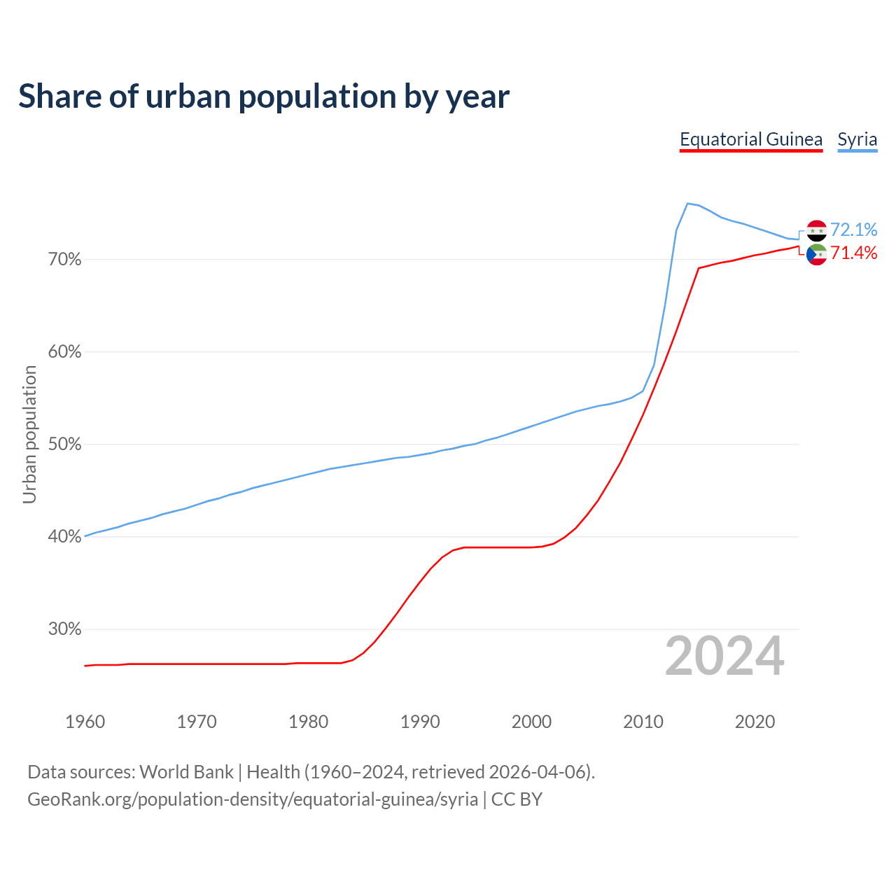 From 2004 to 2024, the share of urban population changed from 40.9% to 71.4% in Equatorial Guinea and from 53.5% to 72.1% in Syria.