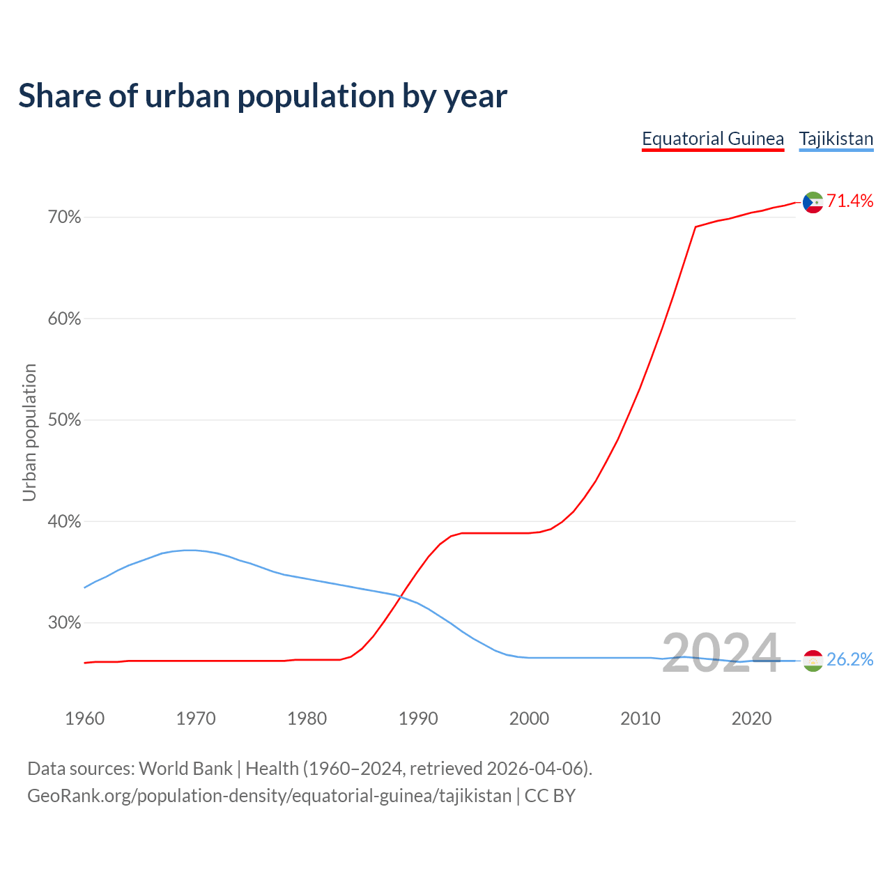From 2004 to 2024, the share of urban population changed from 40.9% to 71.4% in Equatorial Guinea and from 26.5% to 26.2% in Tajikistan.