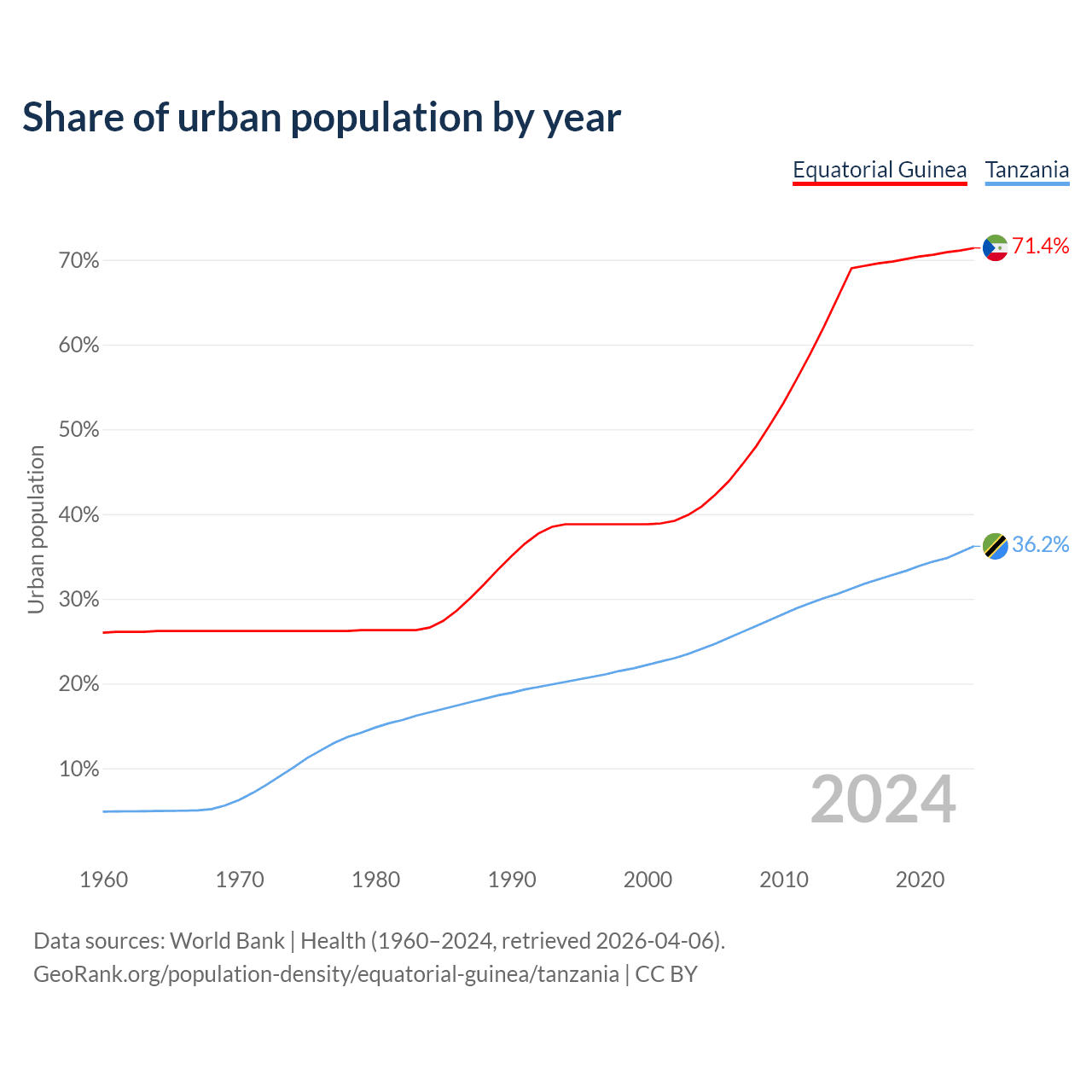 From 2004 to 2024, the share of urban population changed from 40.9% to 71.4% in Equatorial Guinea and from 24.1% to 36.2% in Tanzania.