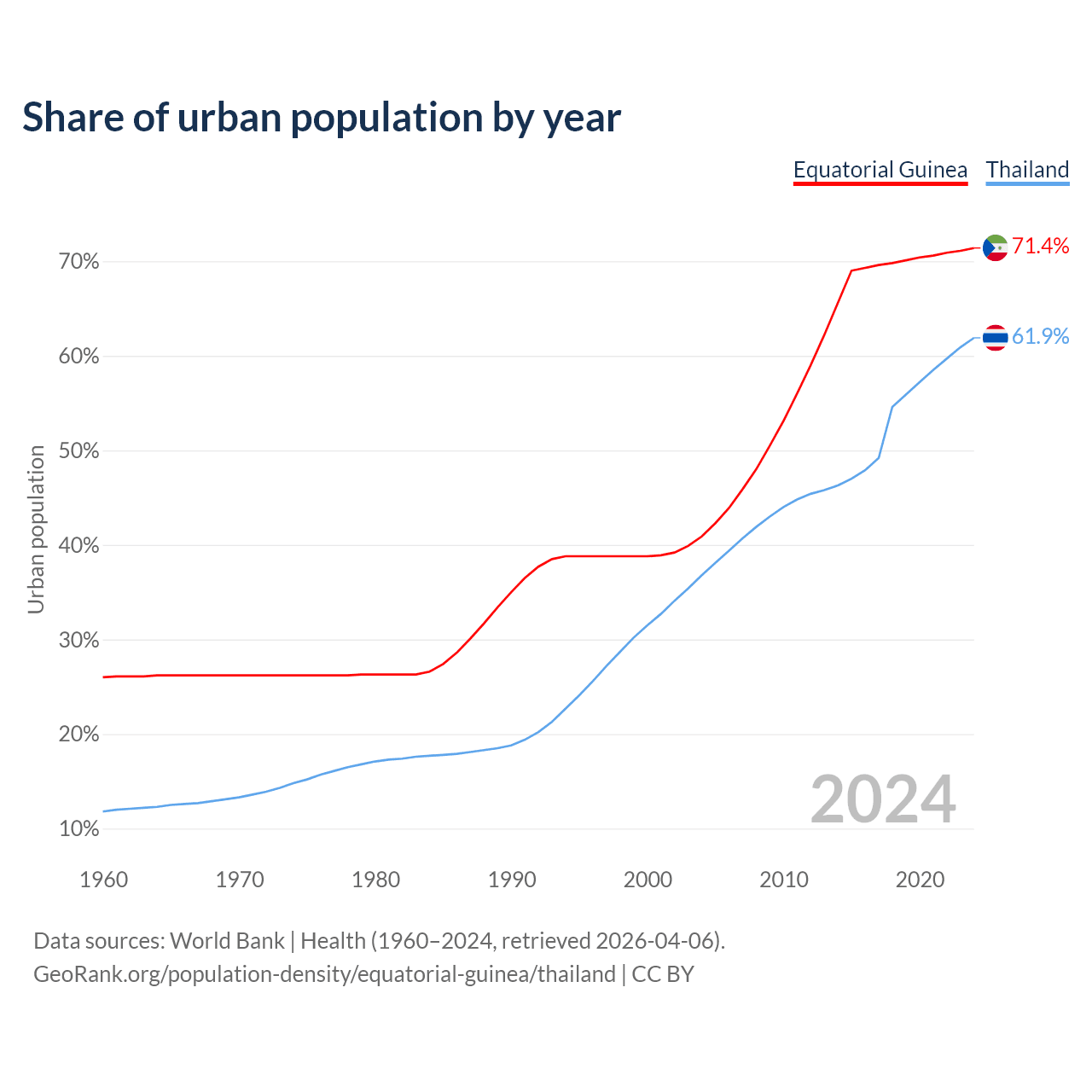 From 2004 to 2024, the share of urban population changed from 40.9% to 71.4% in Equatorial Guinea and from 36.8% to 61.9% in Thailand.