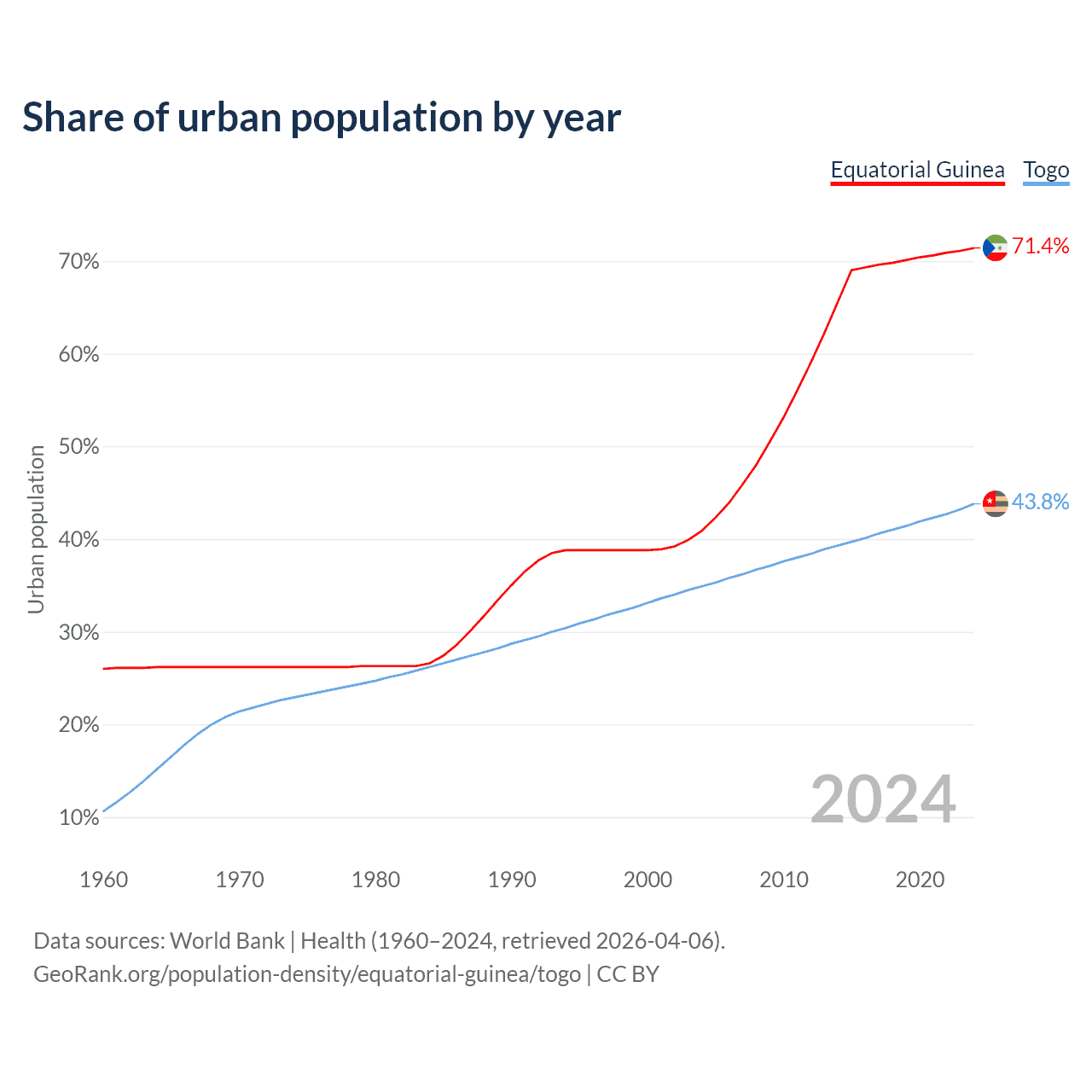 From 2004 to 2024, the share of urban population changed from 40.9% to 71.4% in Equatorial Guinea and from 34.9% to 43.8% in Togo.