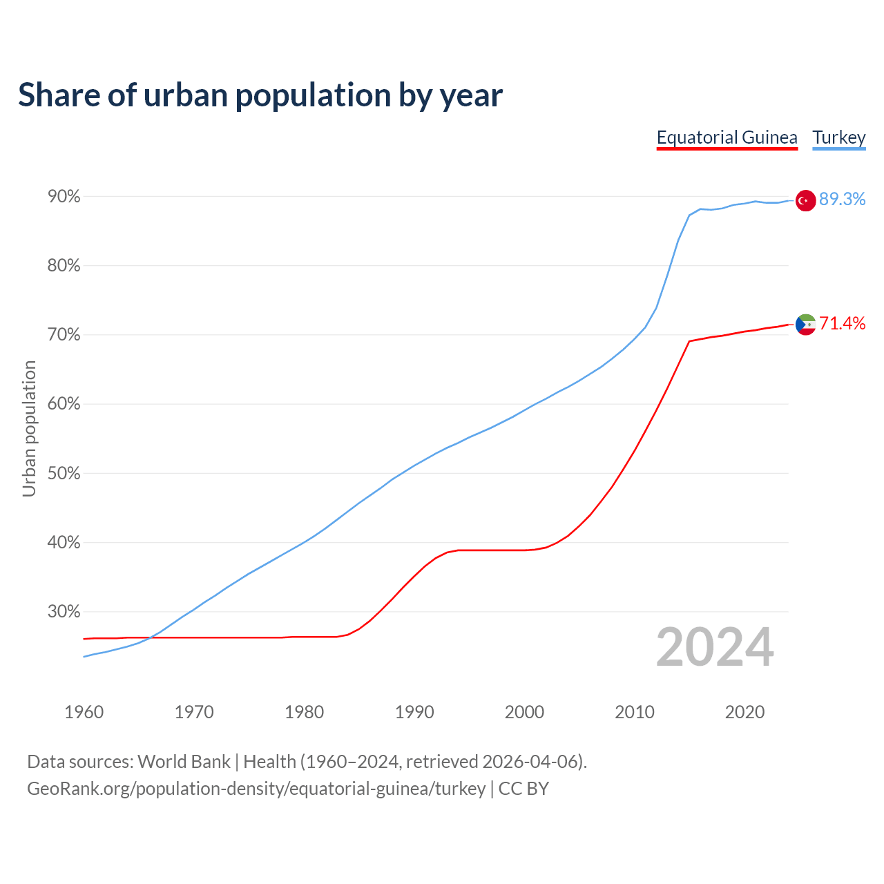 From 2004 to 2024, the share of urban population changed from 40.9% to 71.4% in Equatorial Guinea and from 62.4% to 89.3% in Turkey.