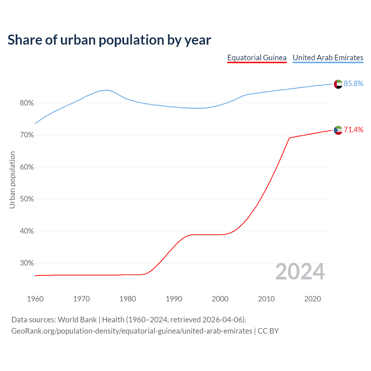 From 2004 to 2024, the share of urban population changed from 40.9% to 71.4% in Equatorial Guinea and from 81.5% to 85.8% in the United Arab Emirates.