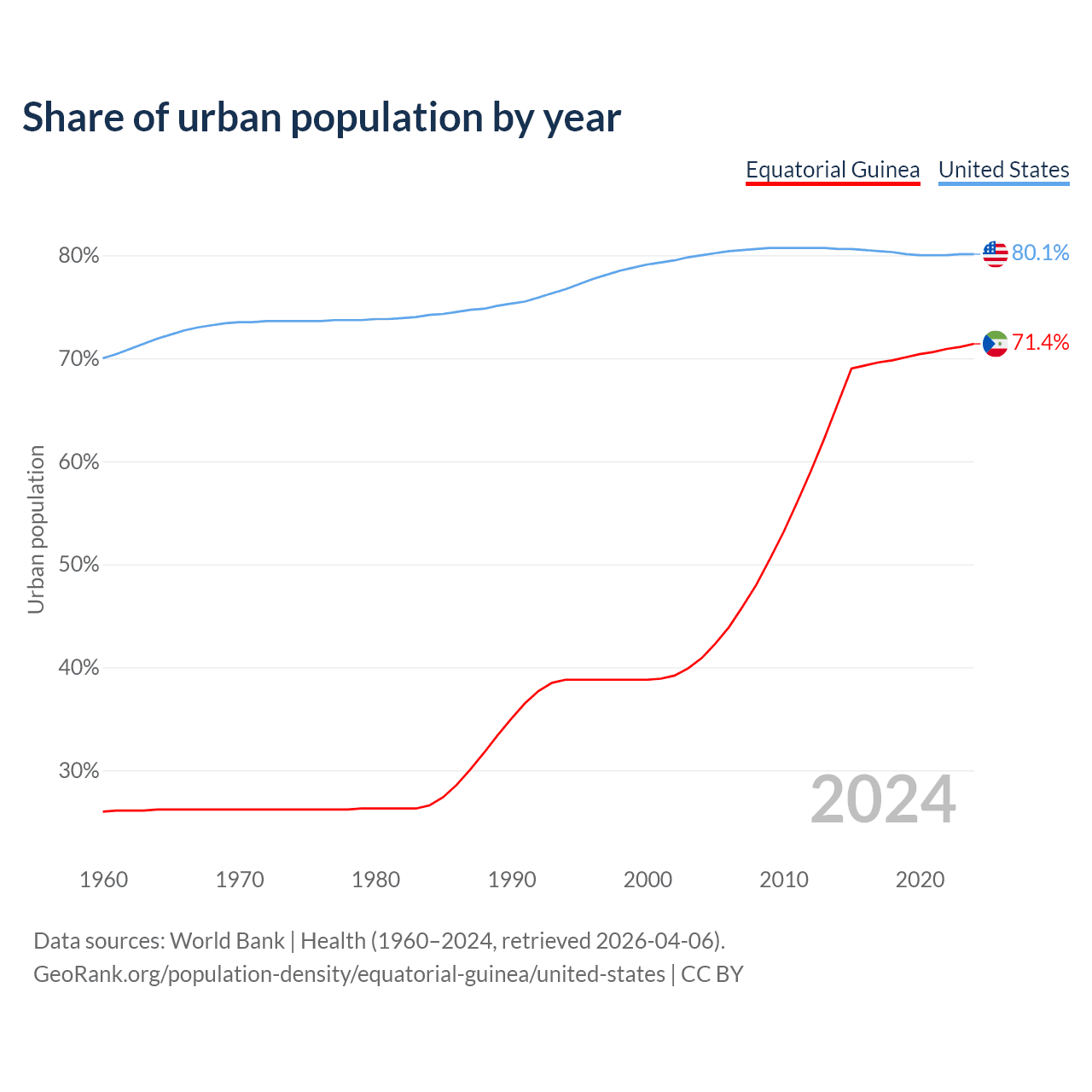 From 2004 to 2024, the share of urban population changed from 40.9% to 71.4% in Equatorial Guinea and from 80% to 80.1% in the United States.